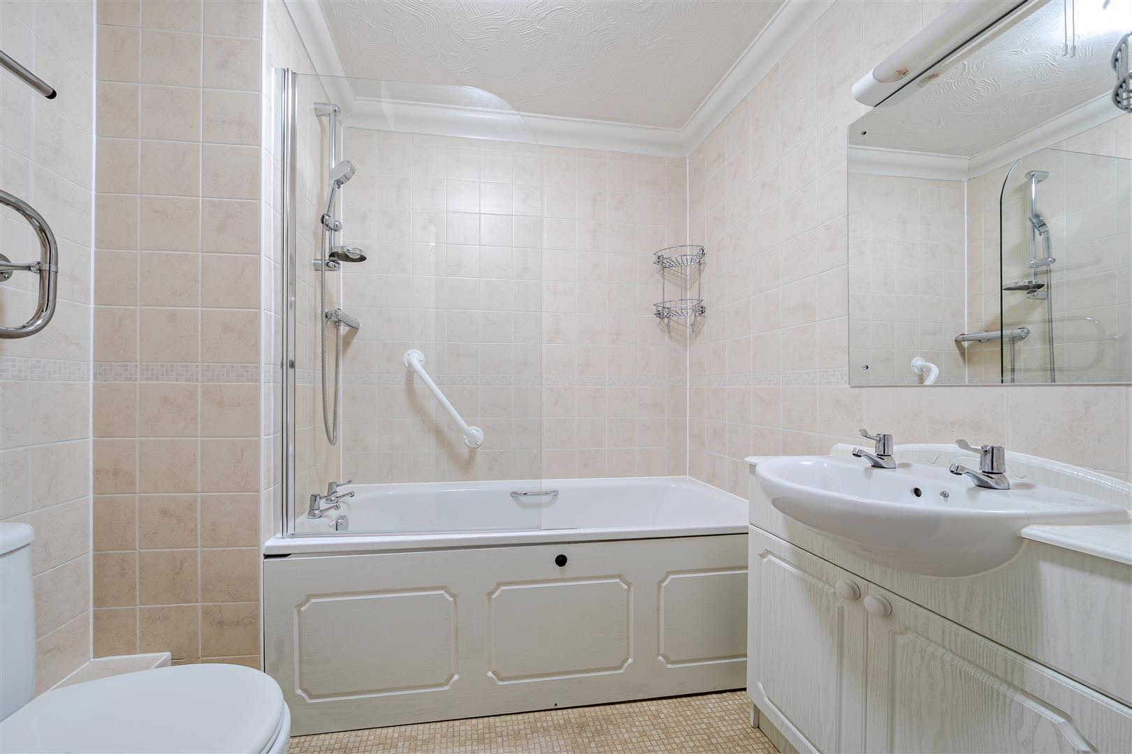 The Bathroom offers a bath tub with overhead shower and handrail, a heated towel rail, WC and wash hand basin with vanity unit beneath.