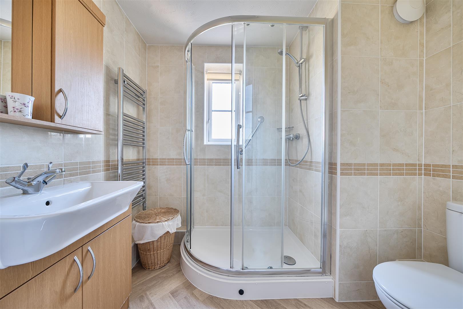 Bedroom one is a generous double room with a built in mirrored wardrobe and additional fitted furniture providing ample storage. An En-Suite offers a curved shower with handrail, a WC, wash hand basin with vanity unit beneath and a heated towel rail.