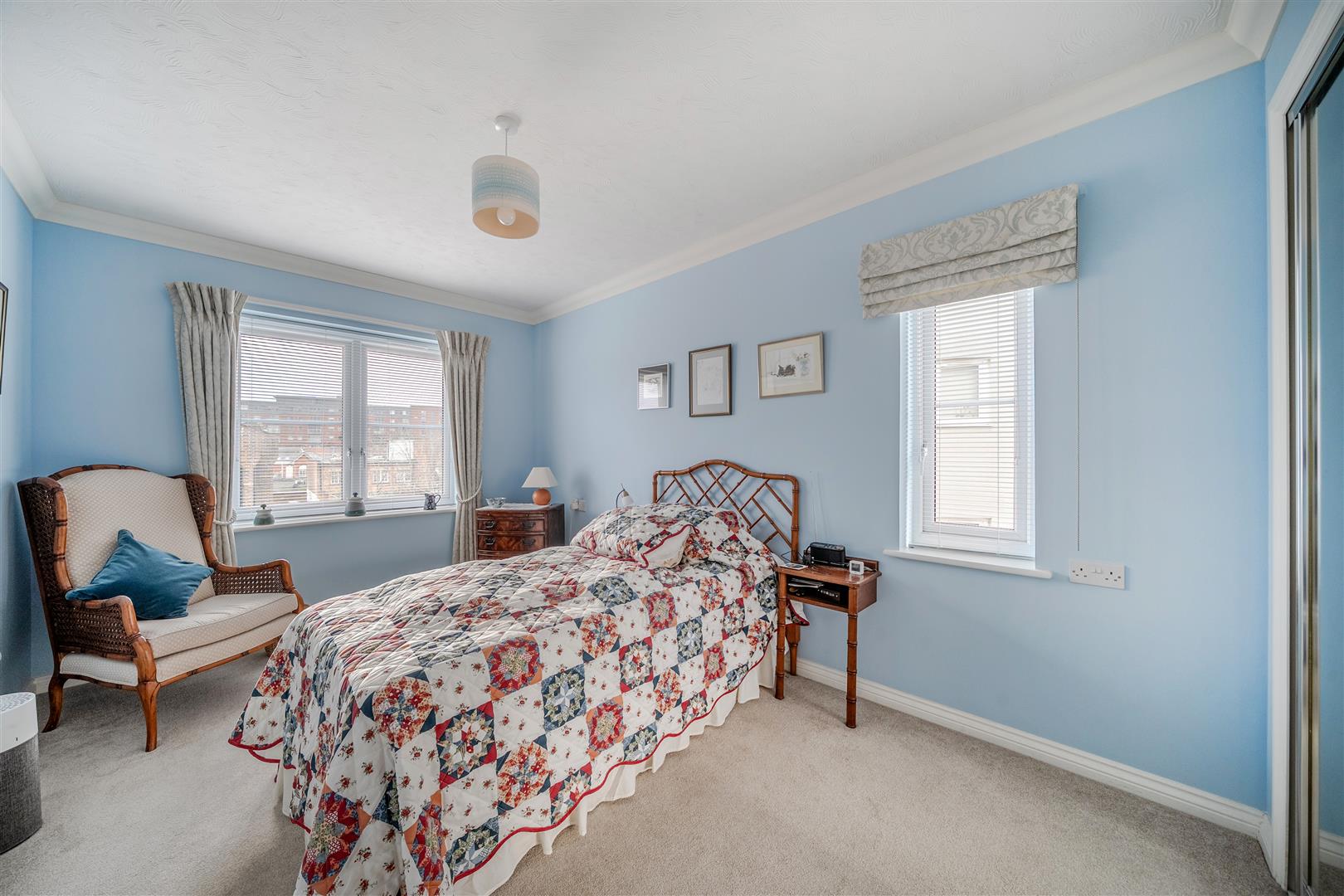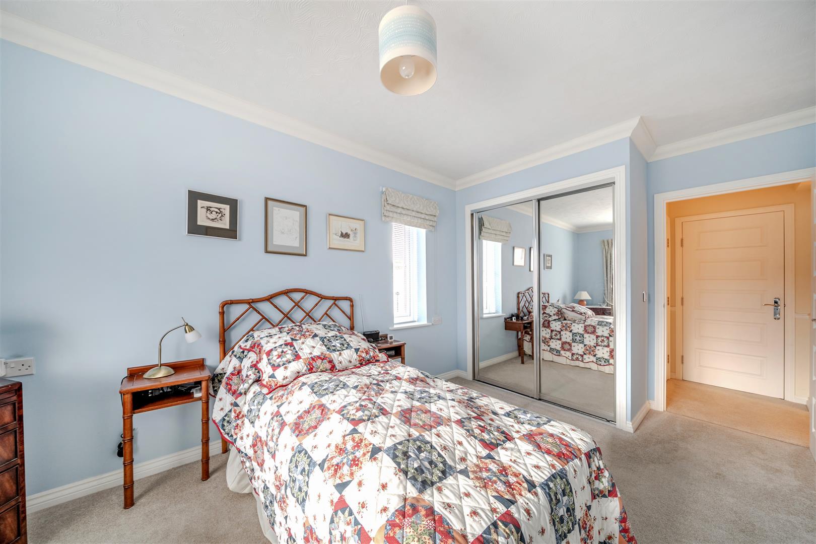 Bedroom One is a generous double with a built-in mirrored wardrobe. There is plenty of space for additional furniture. A large window keeps this lovely bedroom bright and light.