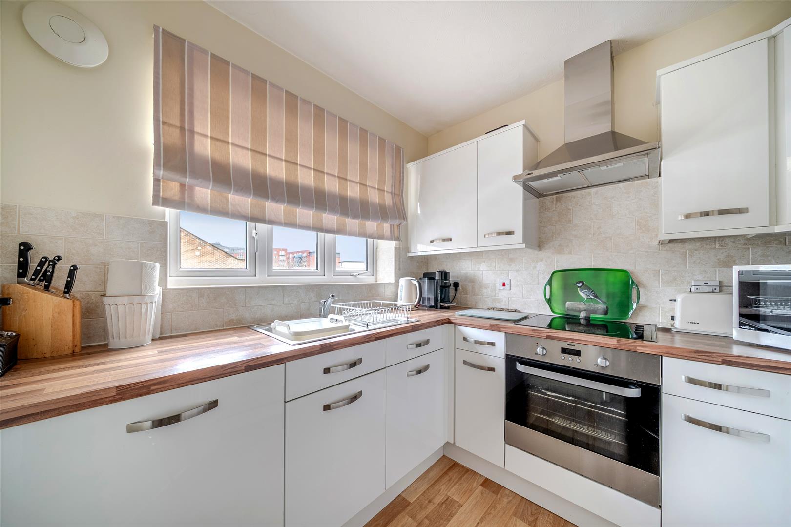 The Kitchen is accessed via the Living Room with a range of modern eye and base level units with working surfaces over and tiled splashbacks. There is a built-in waist-height oven, 4-ring electric hob with extractor hood over, a fridge and freezer. A window allows for light and ventilation.