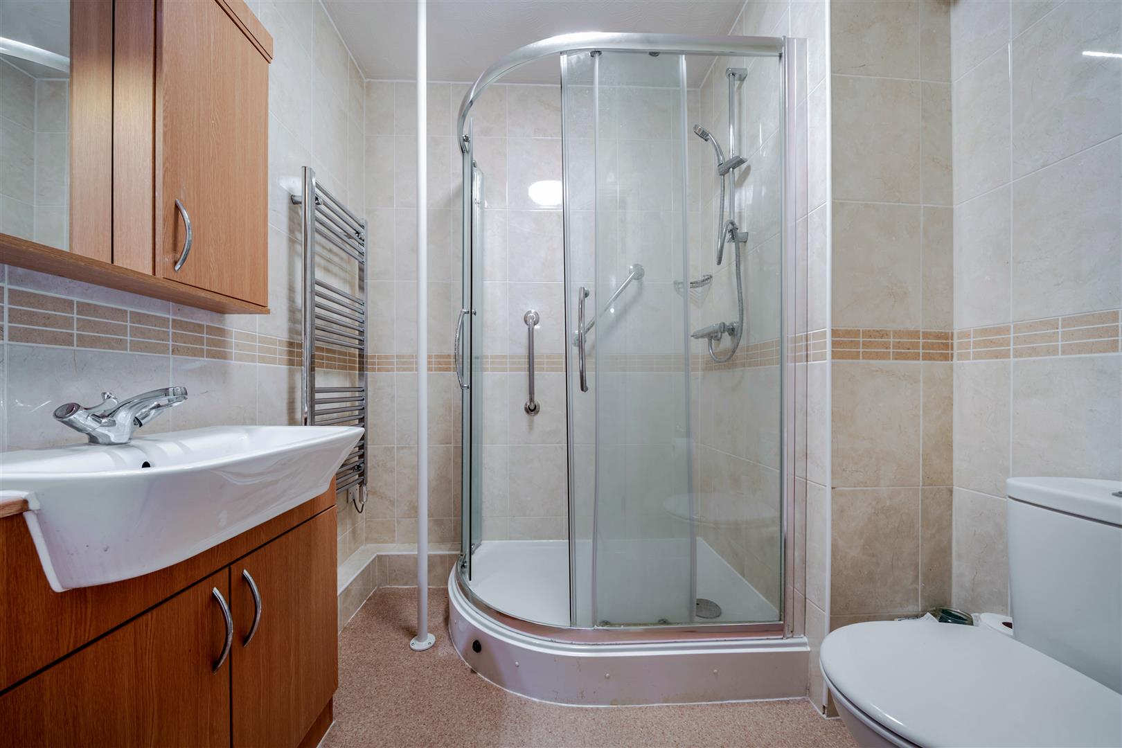 The Shower Room offers a curved shower with handrail, a heated towel rail, WC and wash basin with vanity unit beneath and storage above.