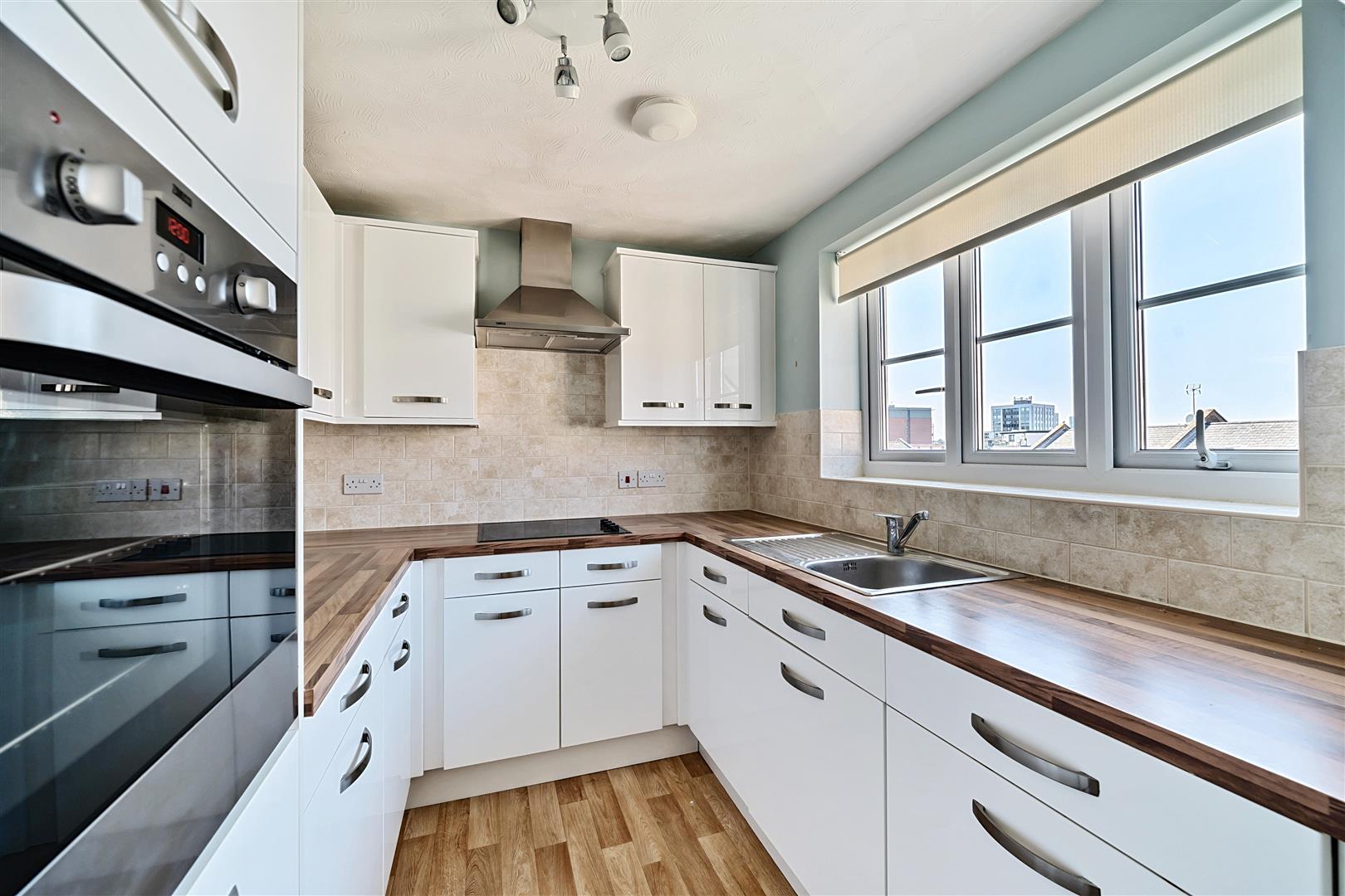 The Lounge is a good size room which has space for living and dining room furniture. A door leads to the Kitchen which has been fitted with a range of eye and base level units with working surfaces over. There is a built in fridge, freezer, oven and 4 ring electric hob with extractor hood over. A window provides lots of light and ventilation as well as rooftop views.