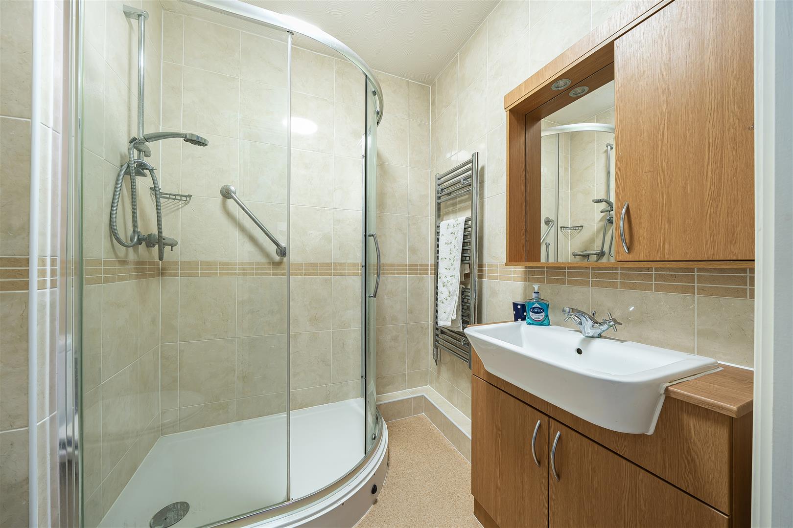 The Shower Room offers a curved shower with handrail, heated towel rail, WC and wash basin with vanity unit beneath.