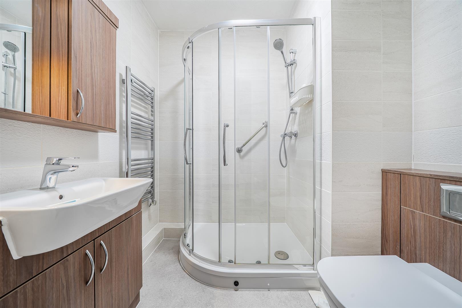 The Shower Room offers a large shower cubicle with handrail, heated towel rail, a WC and wash hand basin with vanity unit beneath.
