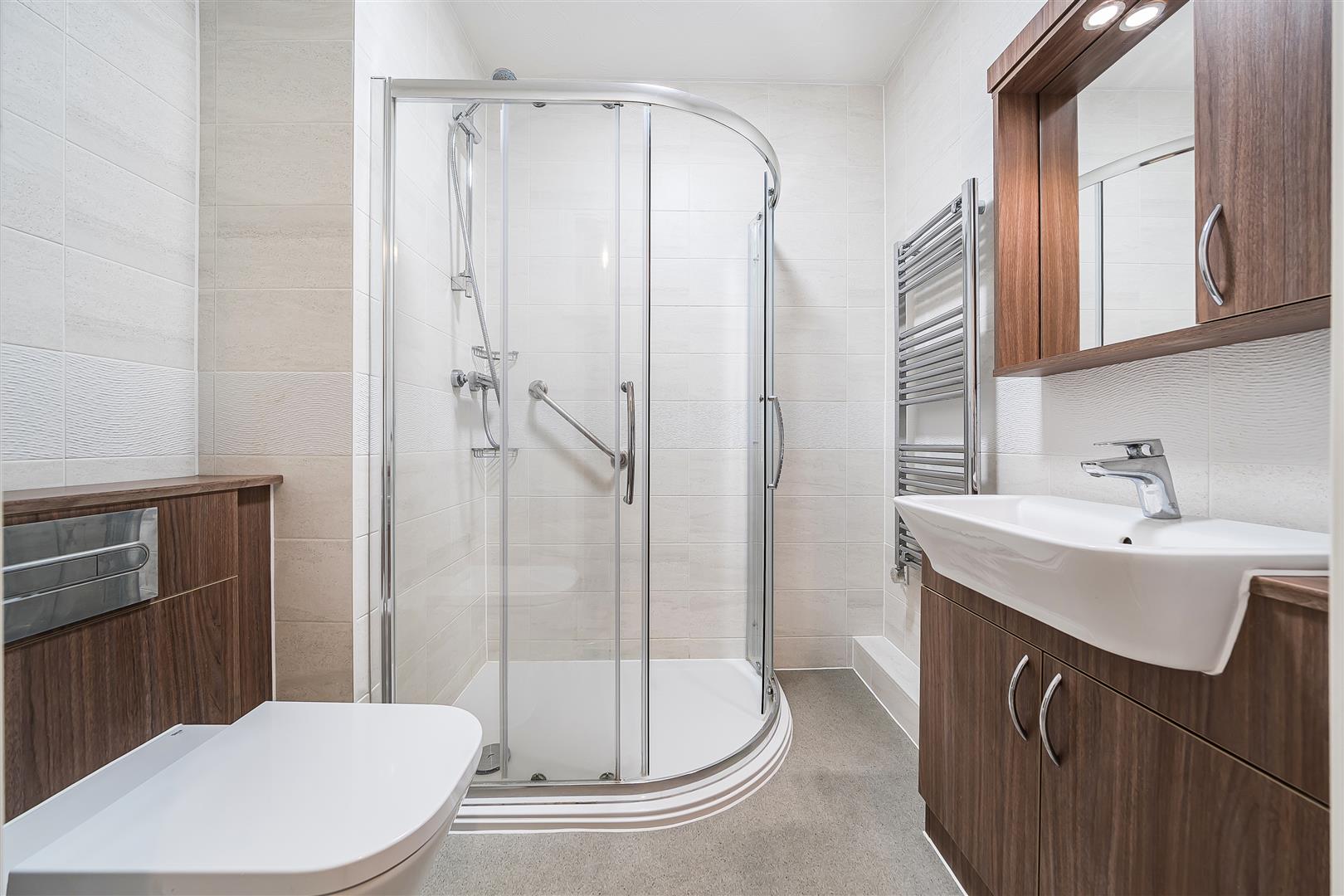 The Shower Room offers a curved shower with handrail, a WC, wash hand basin with vanity unit beneath and a heated towel rail.