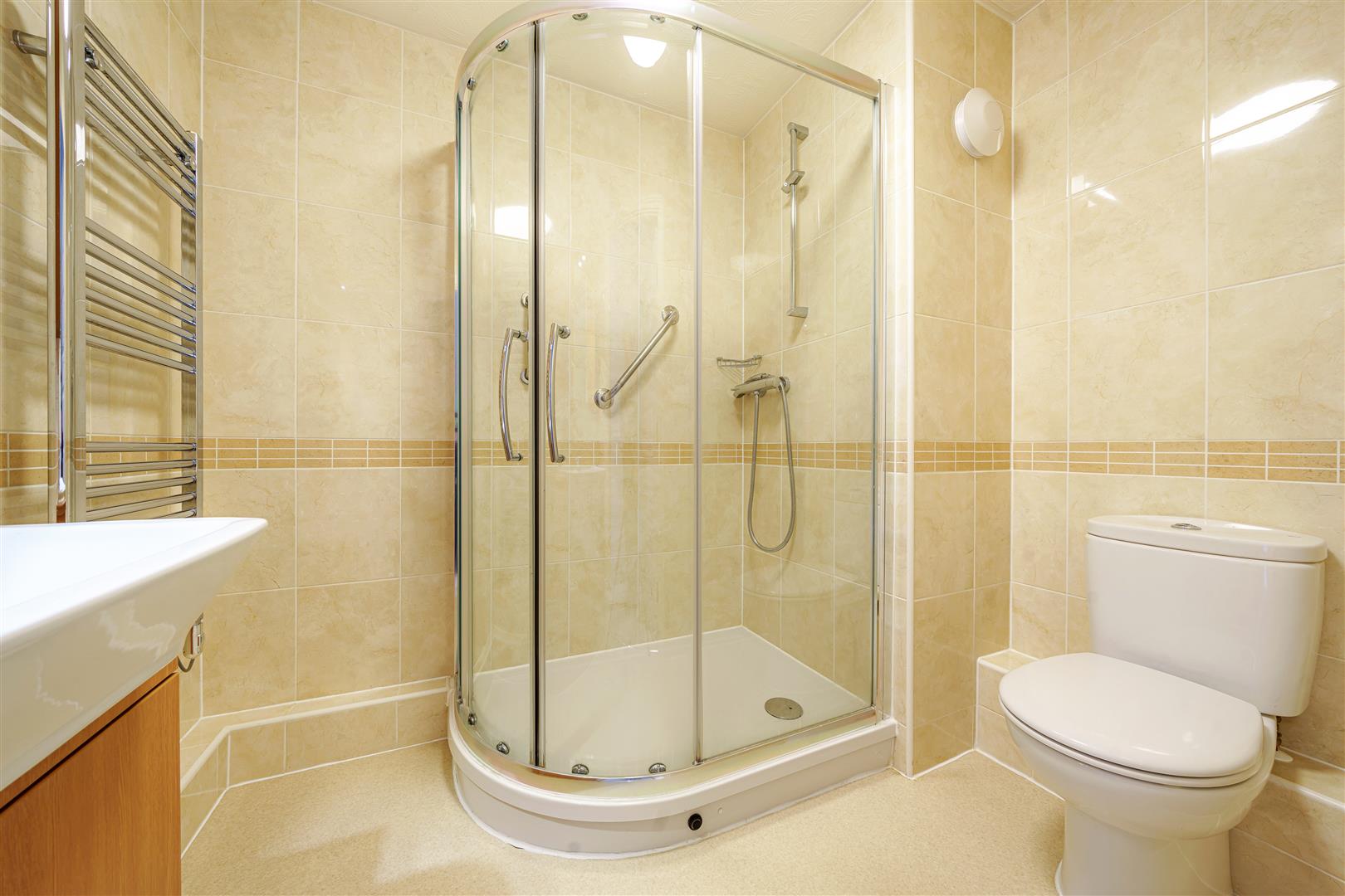 The Shower Room offers a curved shower with handrail and sliding door, a heated towel rail, WC and wash hand basin with vanity unit beneath.