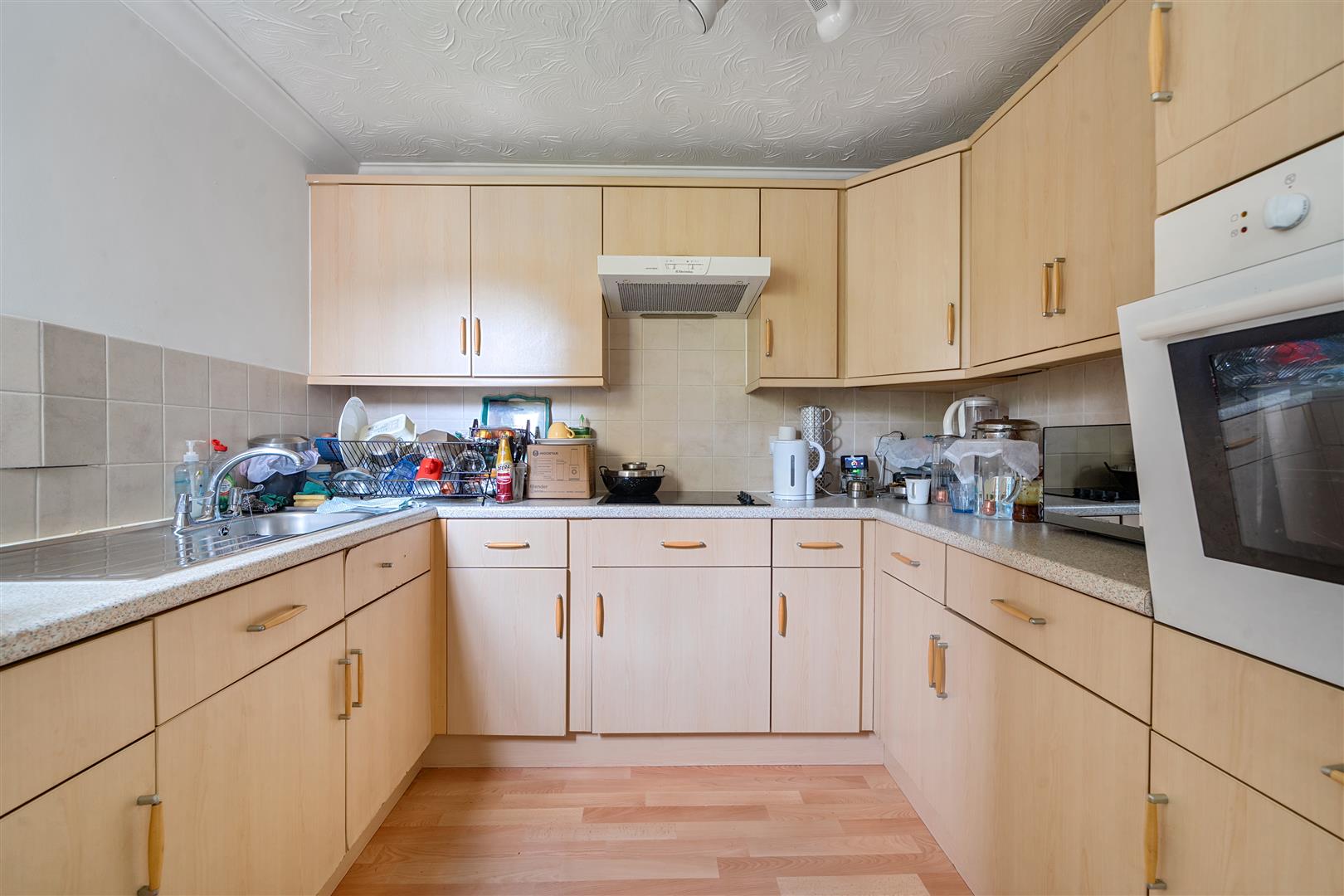 The Kitchen is accessed via the Living room and offers a range of eye and base level units with working surfaces over and tiled splashbacks. There is a built-in waist height oven, 4 ring electric hob with extractor hood over, a fridge and a freezer. A window allows for light and ventilation.