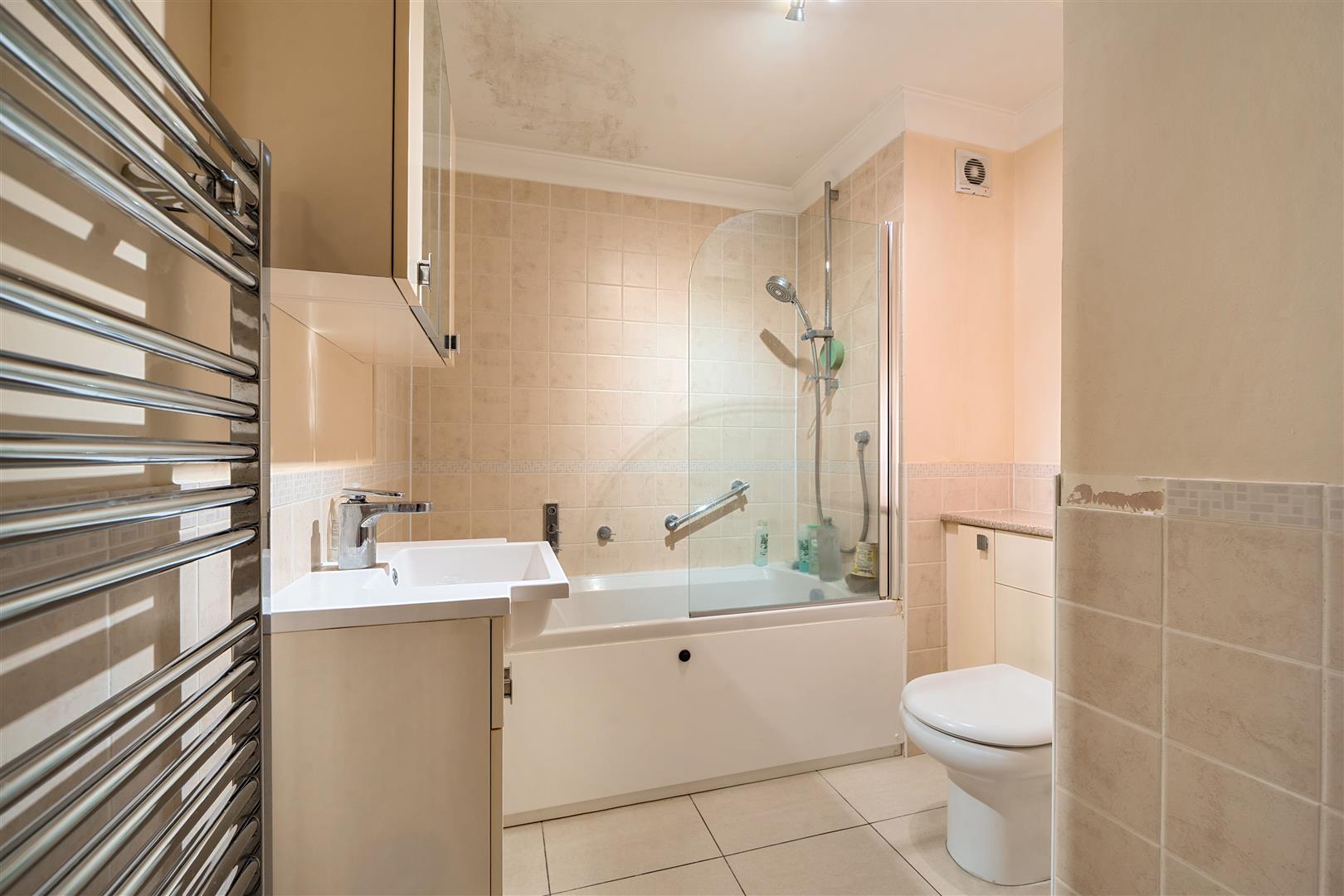 The Bathroom offers a full sized bath with overhead shower and handrail, a heated towel rail, WC and wash hand basin with vanity unit beneath.