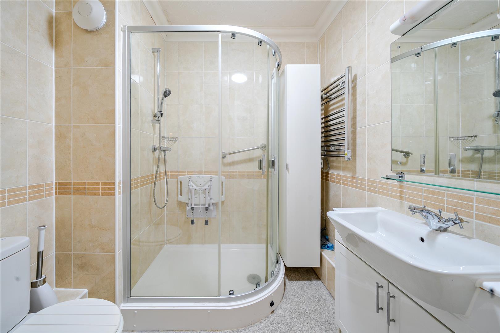 The Shower Room offers a curved shower with handrail, a heated towel rail, WC and wash hand basin with vanity unit beneath.