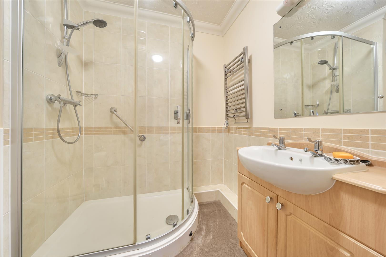 The shower room offers a curved shower with handrail, a WC, wash hand basin with vanity unit beneath and a heated towel rail.