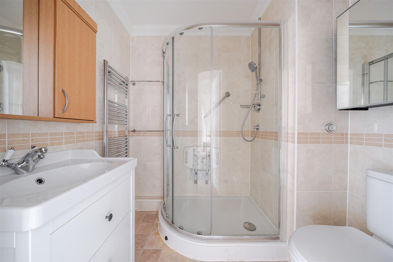 The shower room offers a curved shower with handrail, a WC, wash hand basin with vanity unit beneath and a heated towel rail.