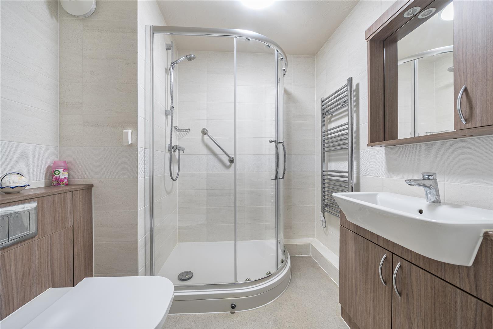 The Shower Room offers a curved shower cubicle with handrail, a heated towel rail, WC and wash hand basin with vanity unit below.