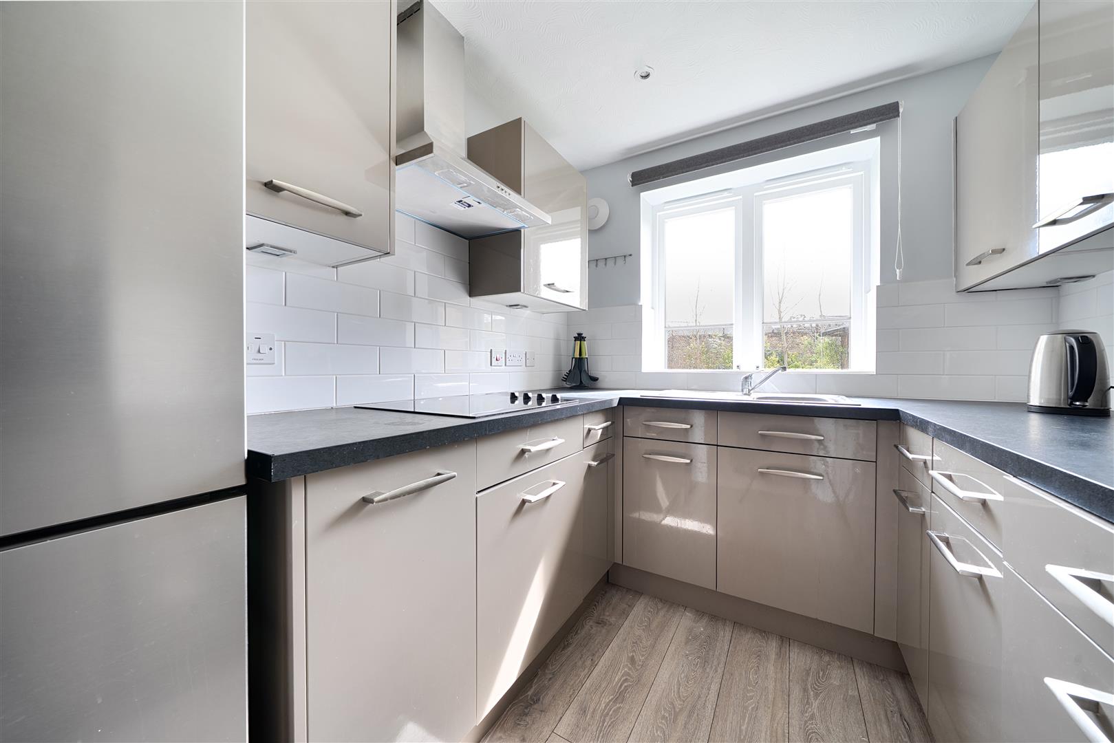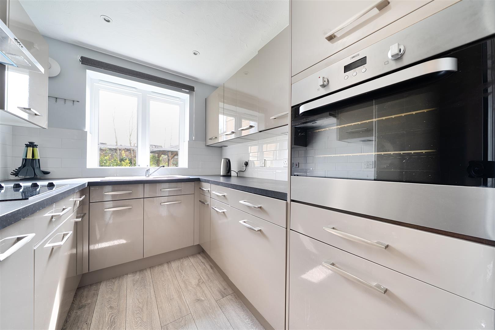 The kitchen is accessed via the living room and offers a range of modern eye and base level units with working surfaces over and tiled splashbacks. There is a built-in oven, 4 ring electric hob with extractor hood over, a fridge/freezer. A window allows for light and ventilation.
