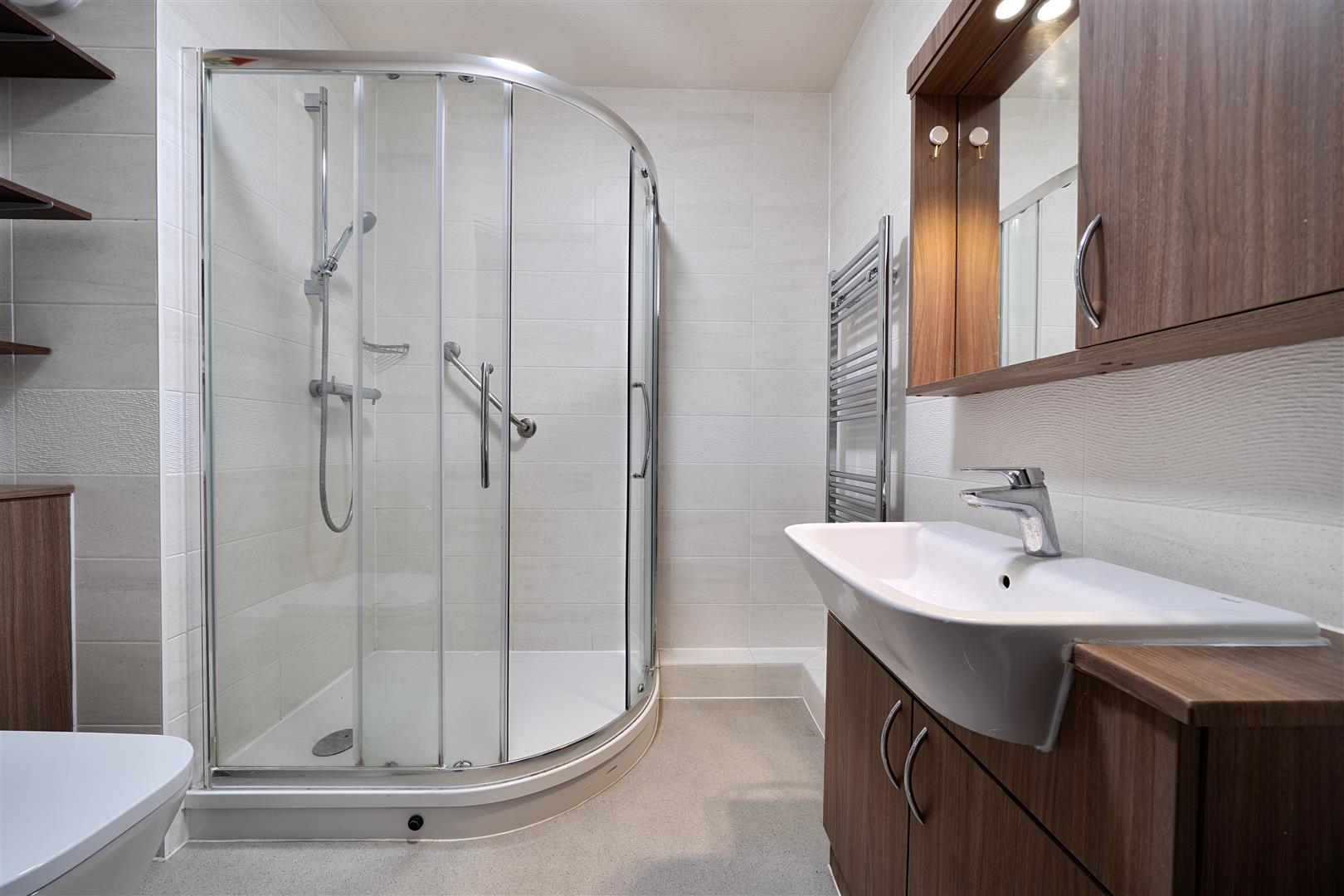 The shower room offers a curved shower with handrail, a WC and wash hand basin with vanity unit beneath and a heated towel rail.