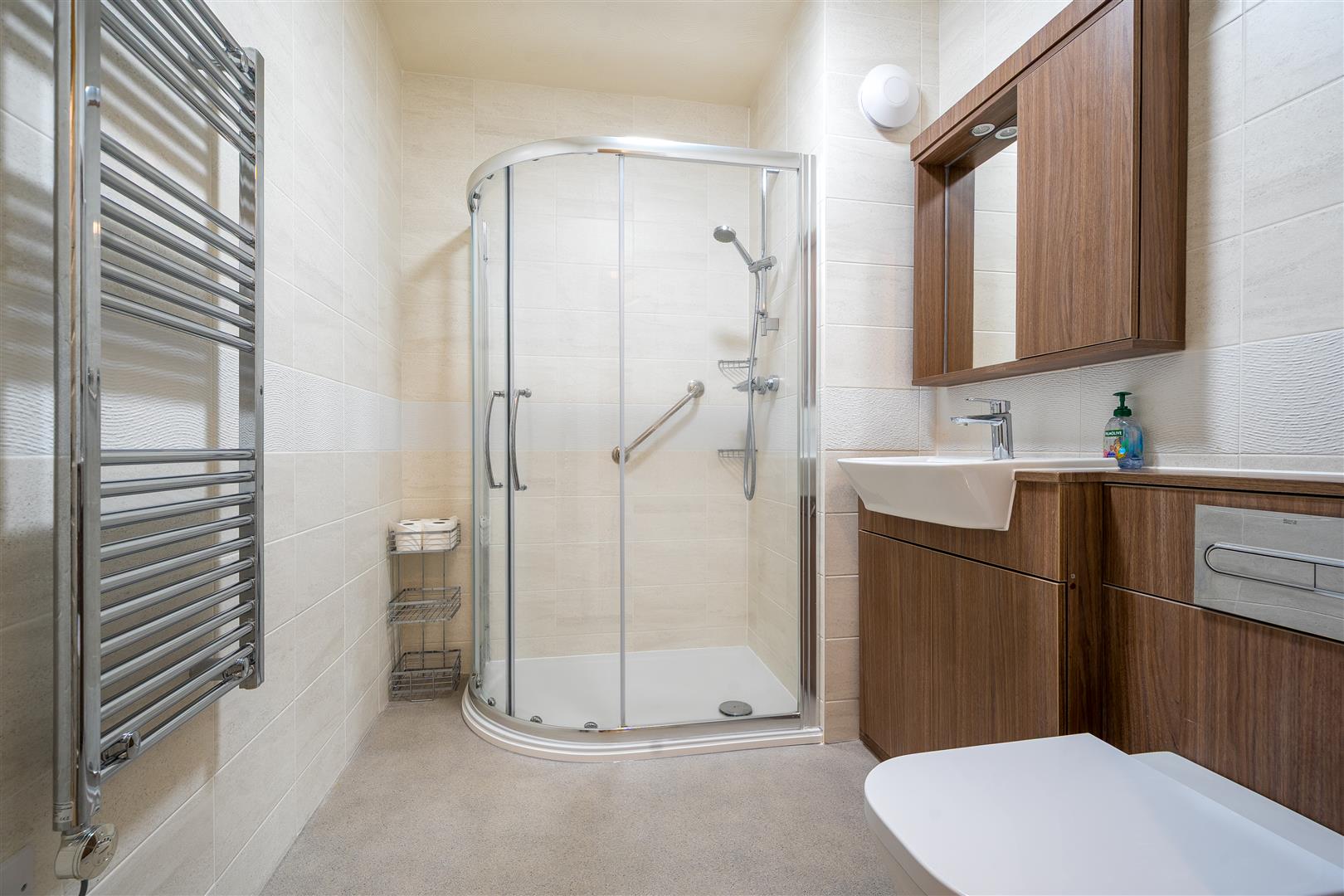 The Shower Room offers a curved shower with handrail, a WC, wash hand basin with vanity unit beneath and a heated towel rail.