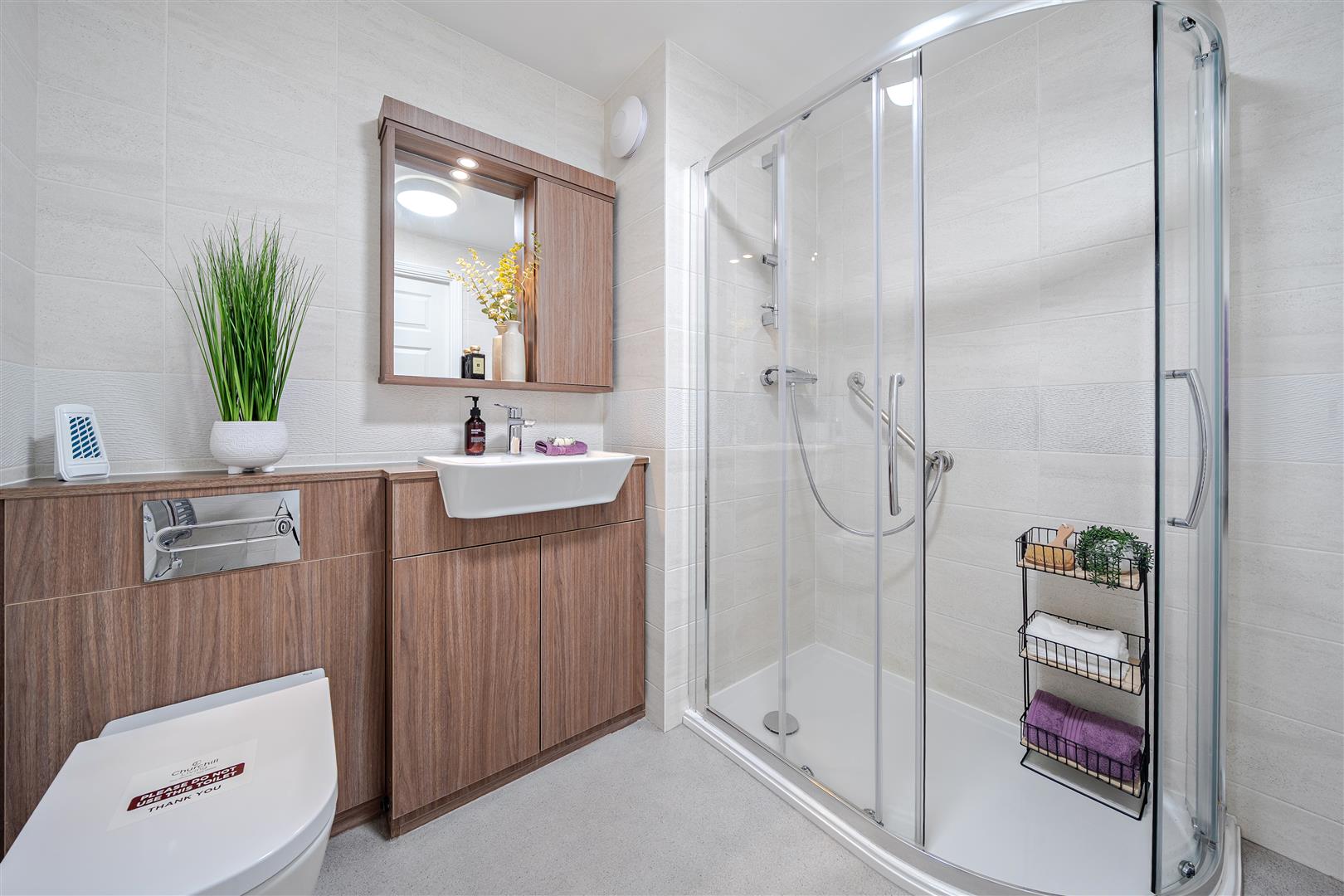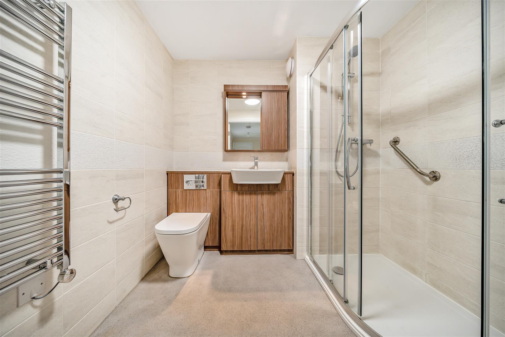 The Shower Room offers a large walk-in shower with handrail, heated towel rail, a WC and wash hand basin with vanity unit beneath.