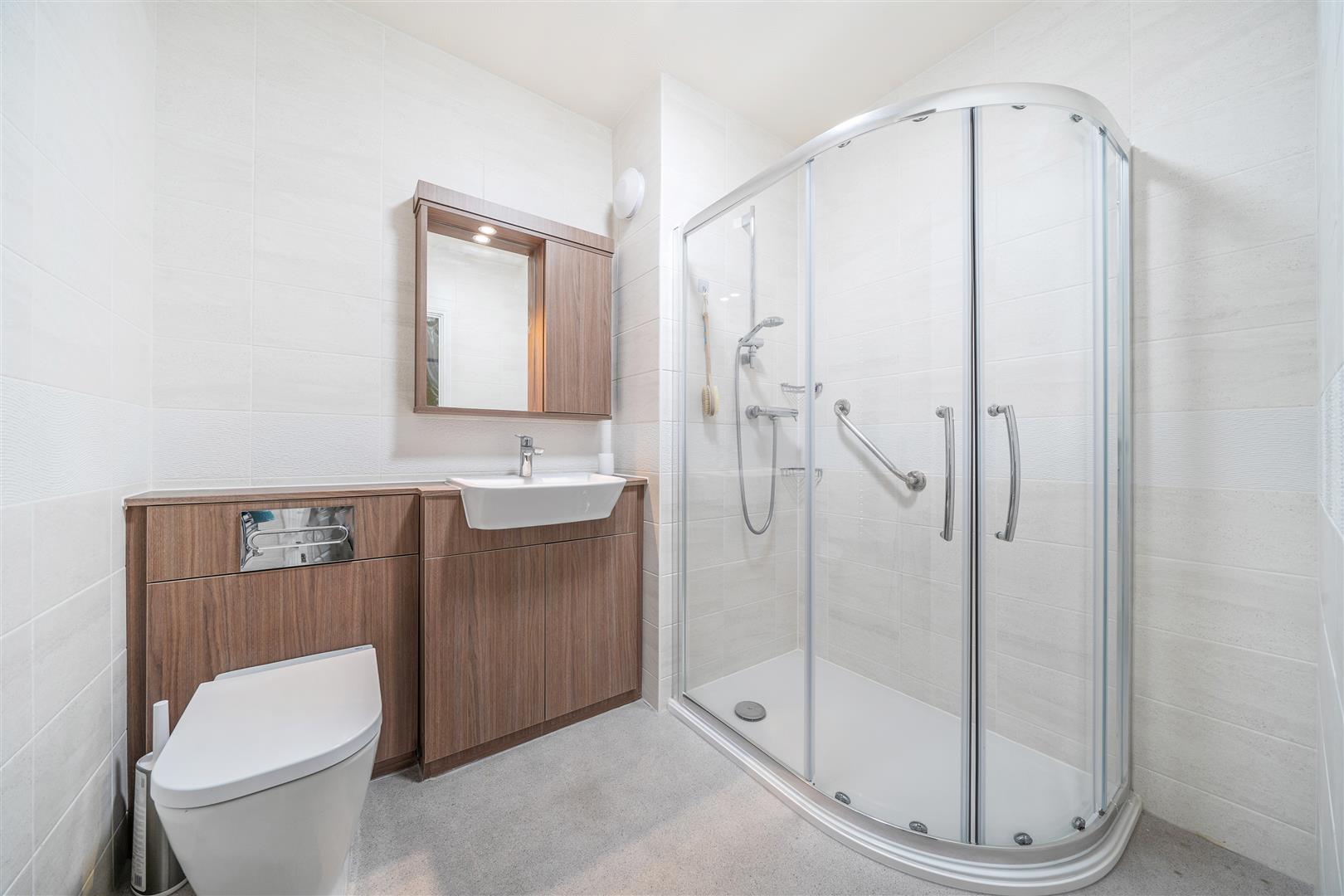 The Shower room offers a curved shower with handrail, a WC, wash hand basin with vanity unit beneath and a heated towel rail.