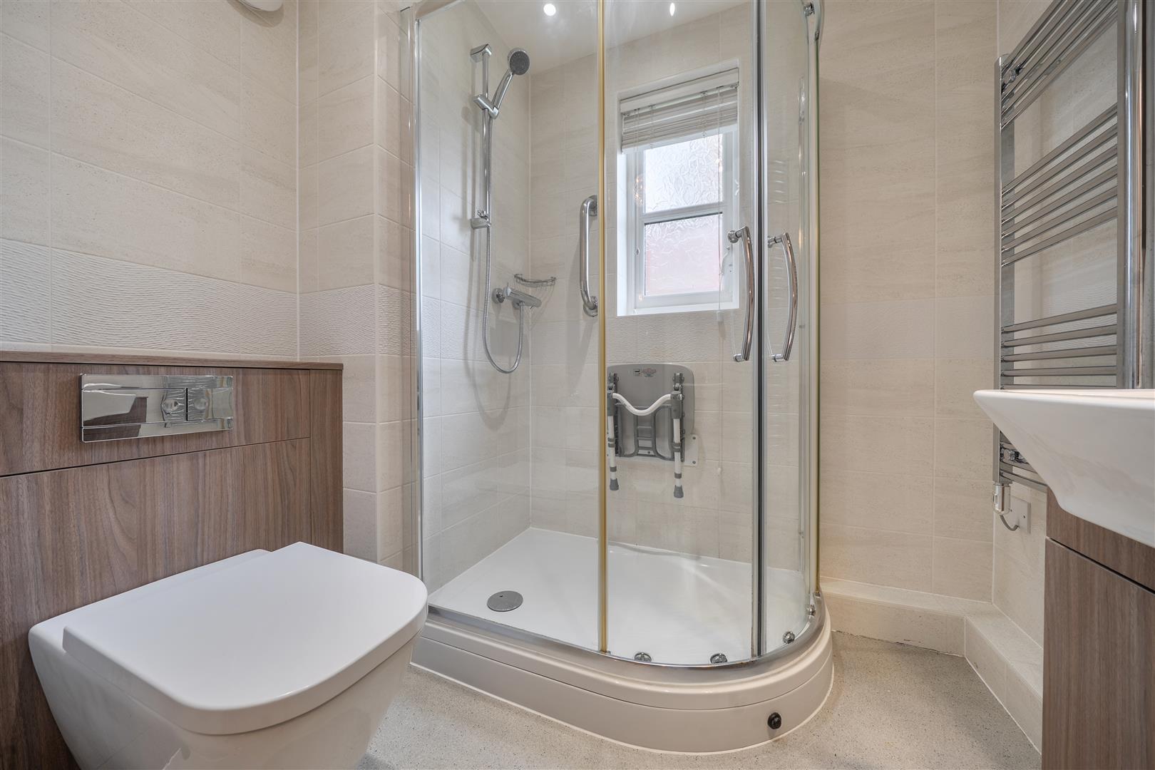 The shower room offers a curved shower with handrail, a heated towel rail, WC and wash hand basin with vanity unit beneath.