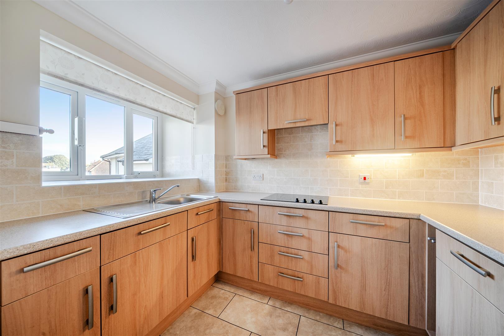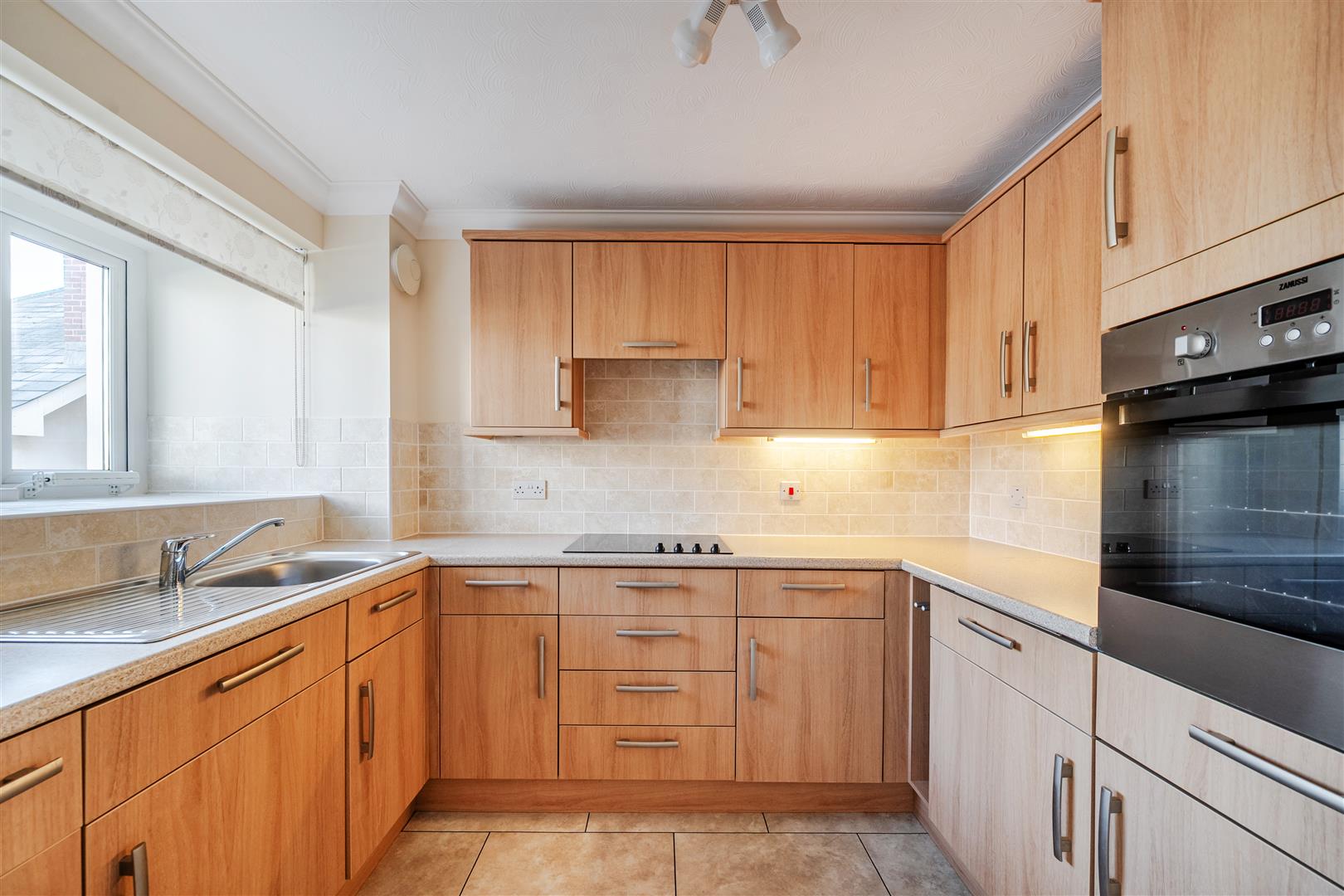 The Kitchen offers a range of eye and base level units with working surfaces over and tiled splashbacks. There is a built in waist height oven, 4 ring electric hob, fridge and freezer. A window provides light and ventilation.