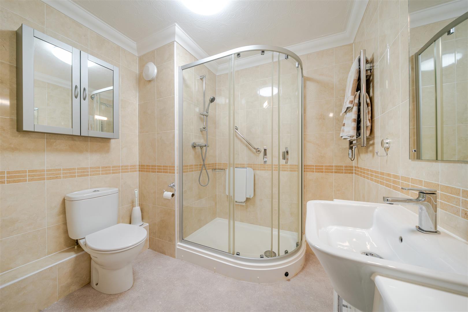 The Shower Room offers a large curved shower with handrail, a WC, wash hand basin with vanity unit beneath and a heated towel rail.