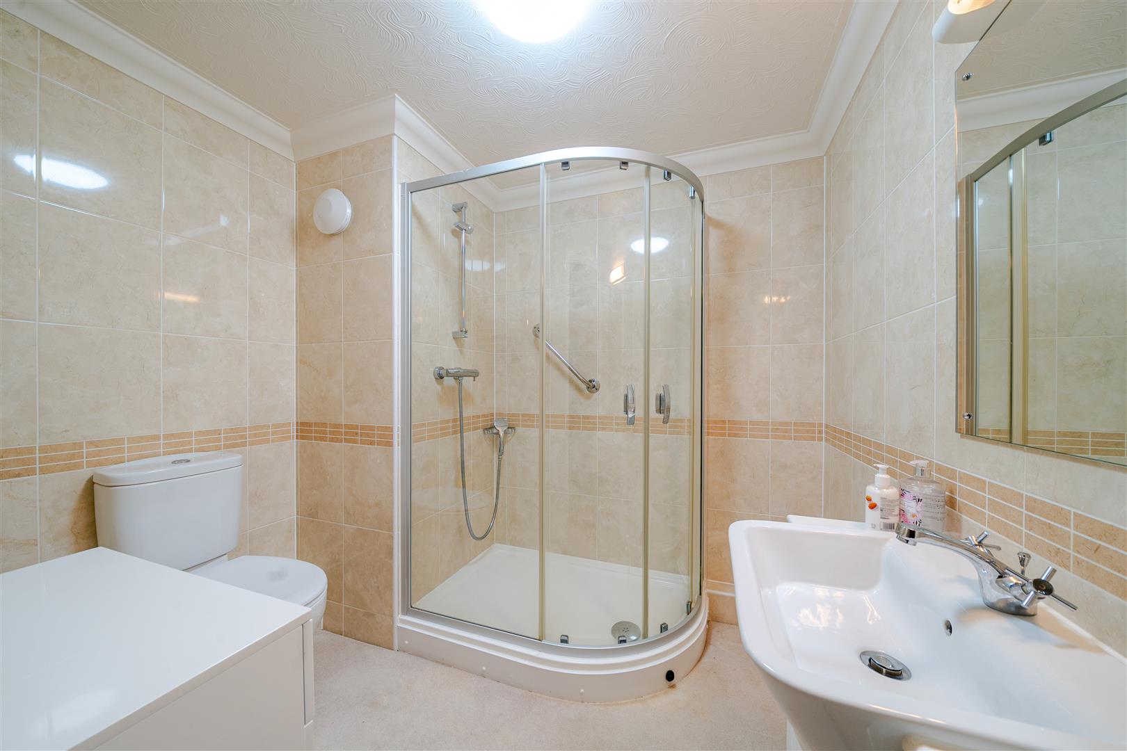 The shower room offers a curved shower with handrail, a WC, wash hand basin with vanity unit beneath and a heated towel rail.
