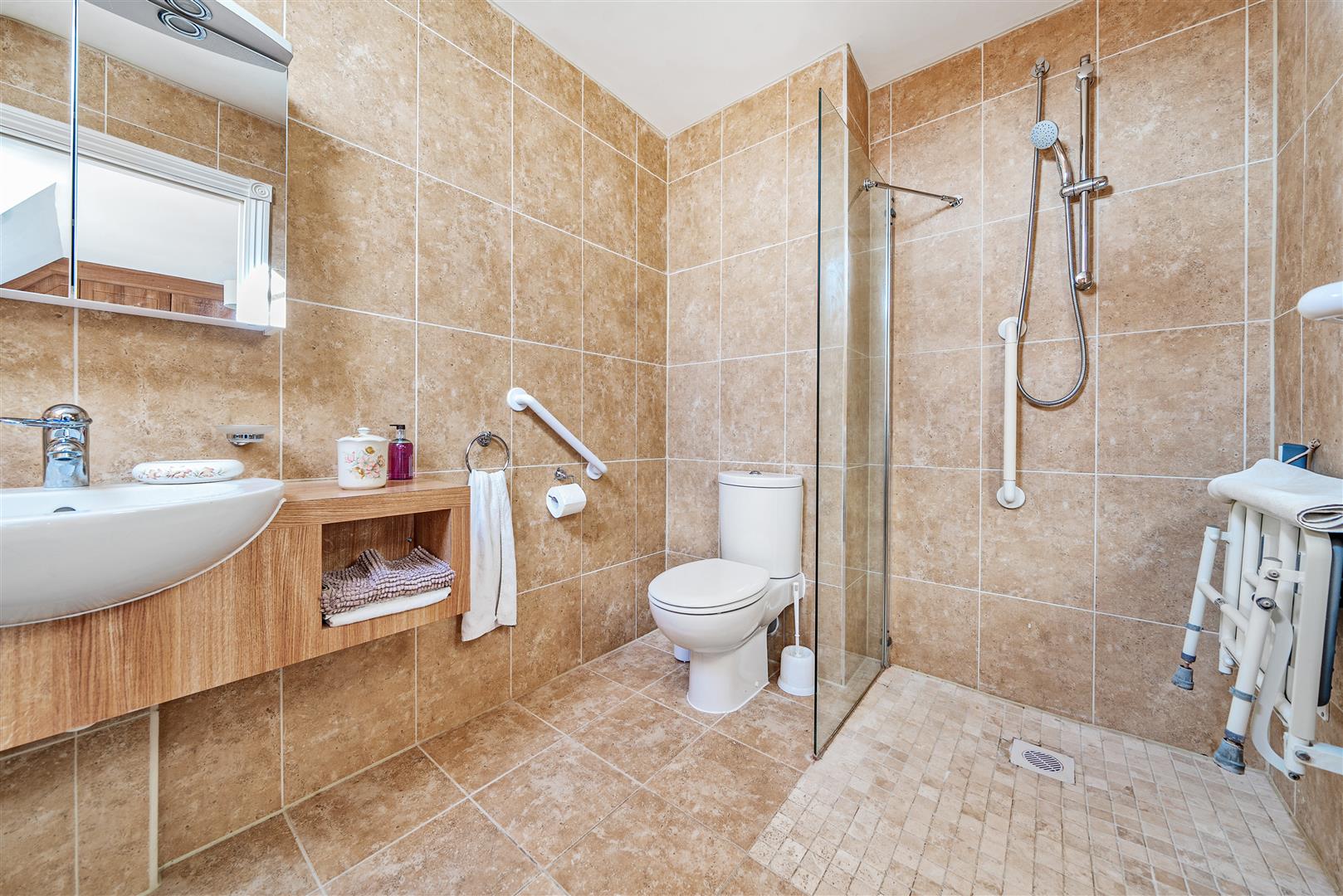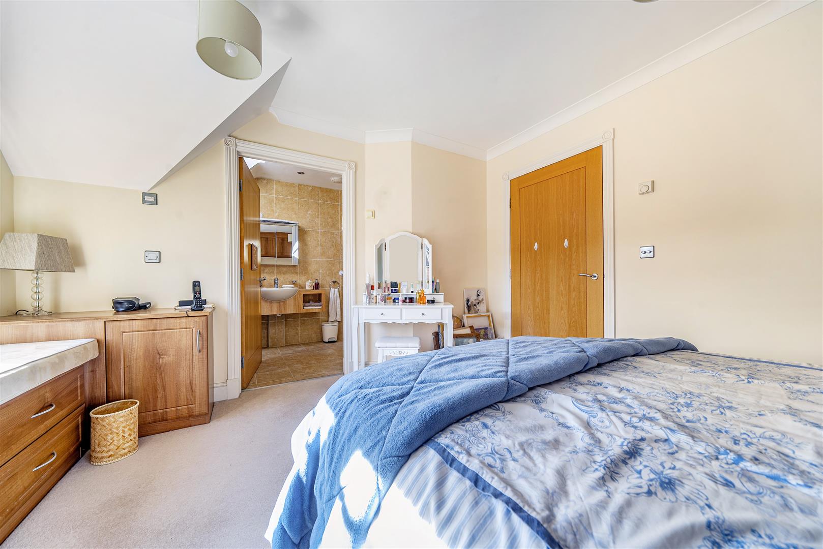 Bedroom one is a generous double room with plenty of useful built in storage and feature window seat. There is an ensuite that includes a large open shower with shower seat and handrail, a WC, a wash hand basin with floating vanity unit below and mirrored cabinet above.
