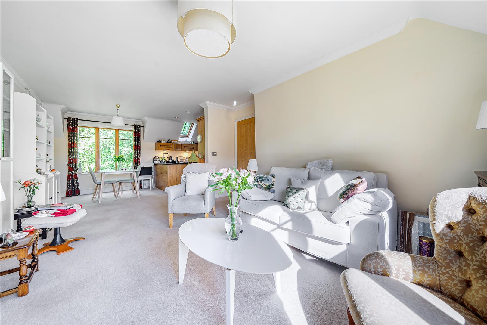The living/dining Room is open plan with the kitchen and offers ample space for furniture. There are dual aspect windows which allow lots of natural light in and also provide lovely views of the communal gardens.