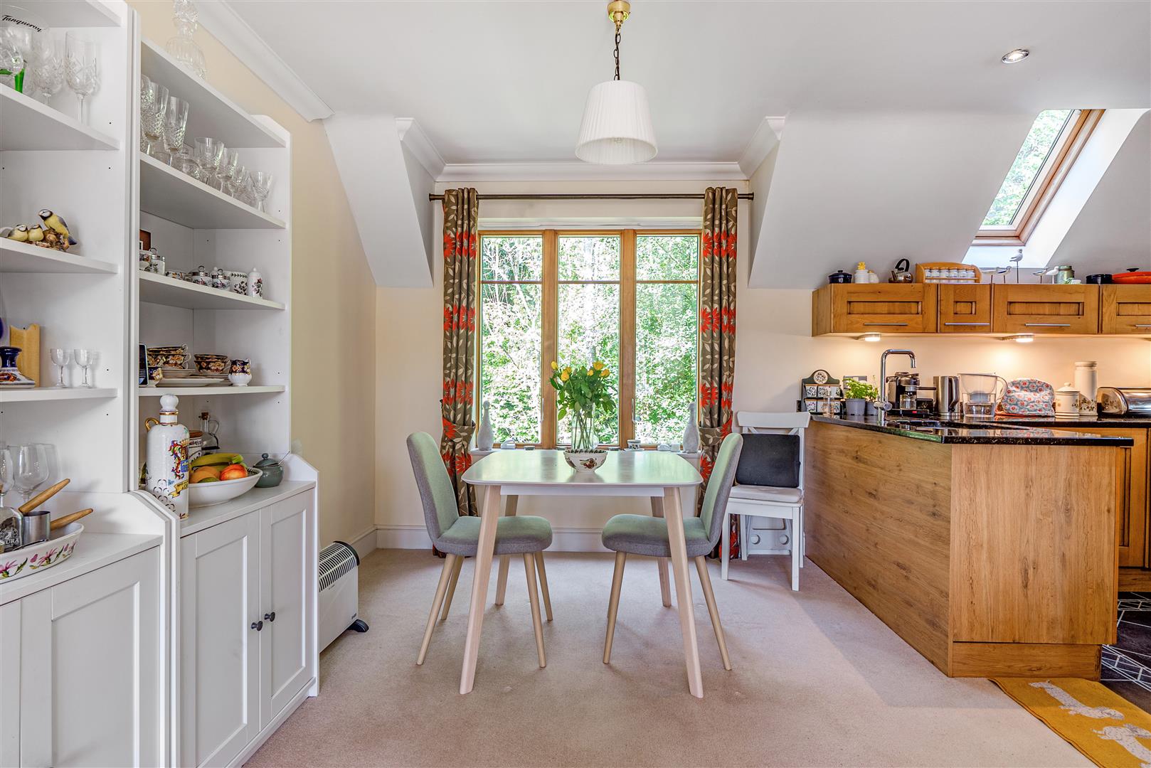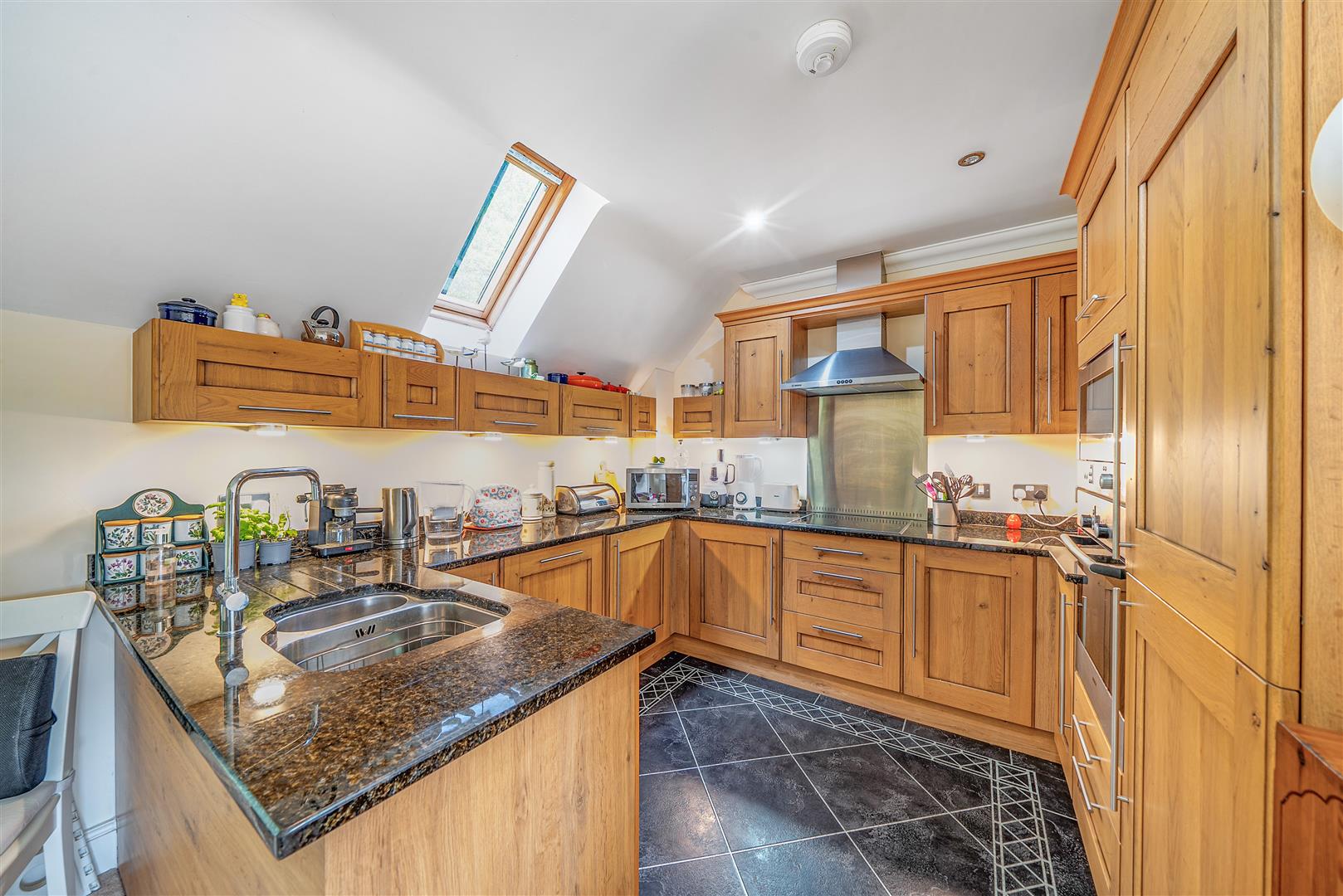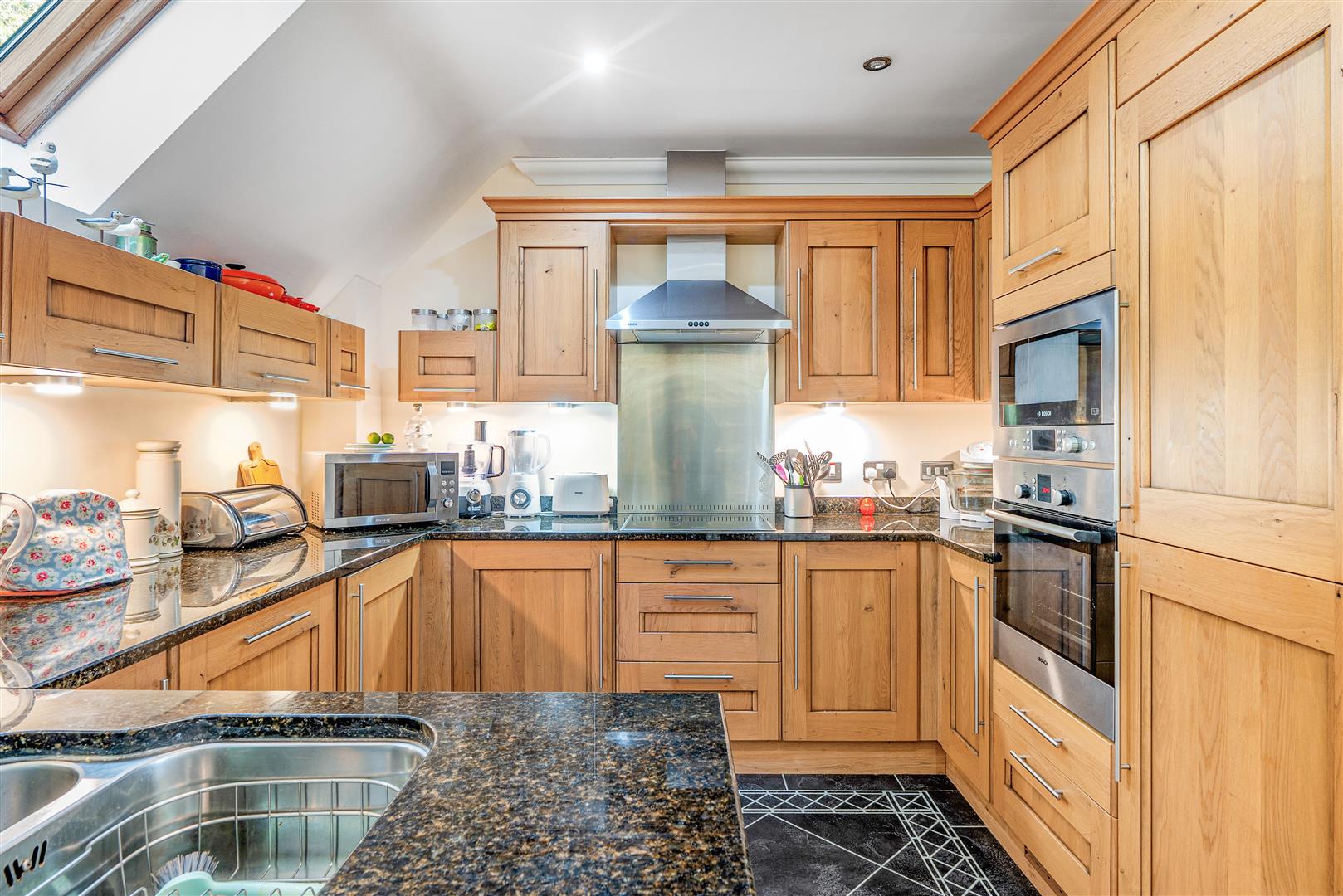 The kitchen offers plenty of storage with a range of eye and base level units and working surfaces over. There is a built in double oven, 4-ring electric hob with extractor hood over, a built in fridge, a freezer and dishwasher. A skylight allows for light and ventilation.