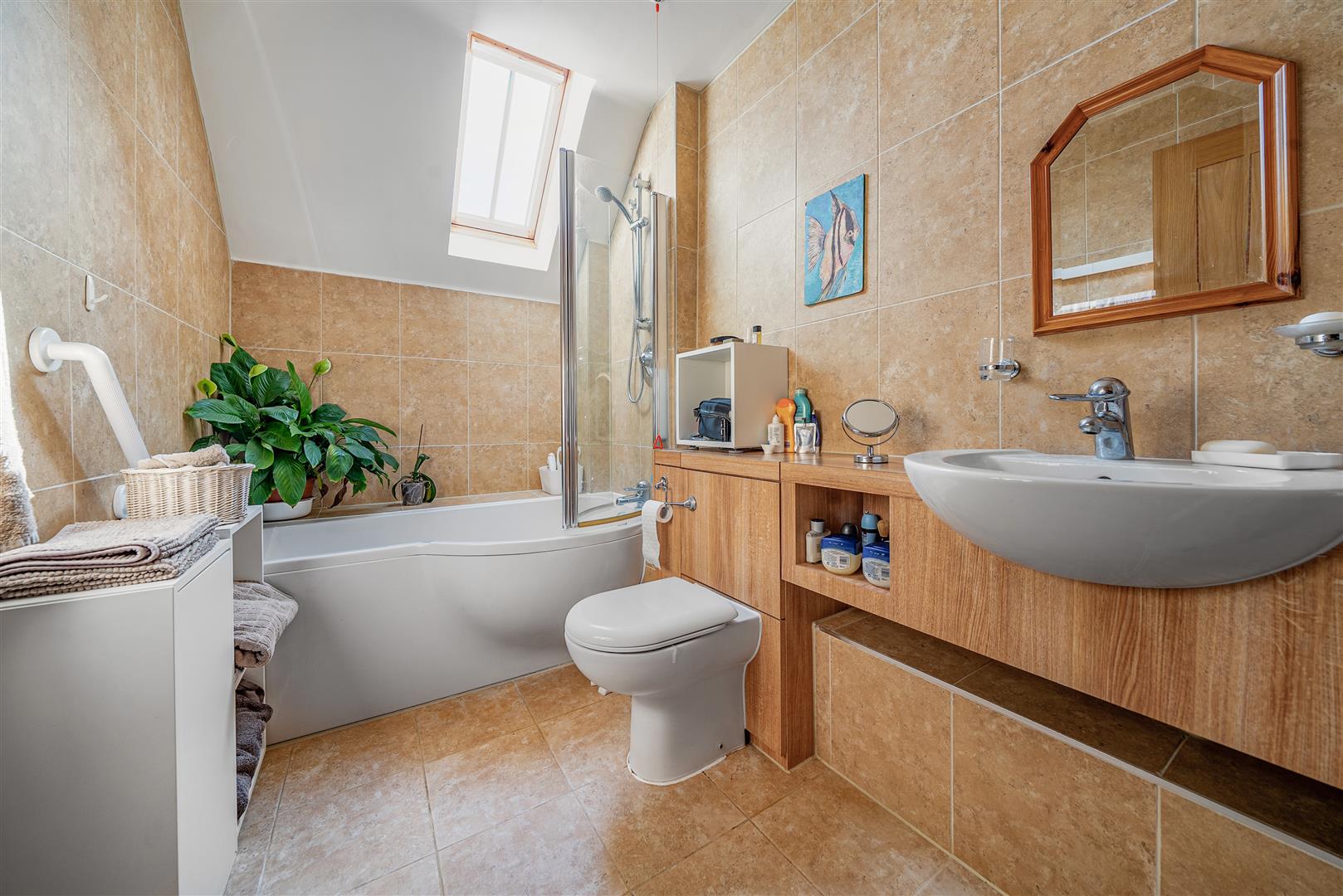 The bathroom offers a good sized bath with showerhead above, a handrail, a WC and wash hand basin with vanity unit beneath. It also benefits from a skylight.