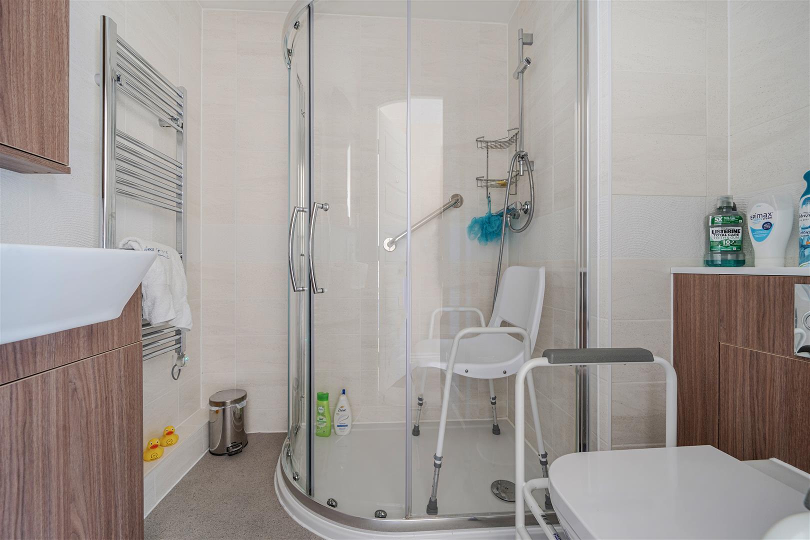 The Shower Room offers a curved shower with handrail, a WC, wash hand basin with vanity unit beneath and a heated towel rail.