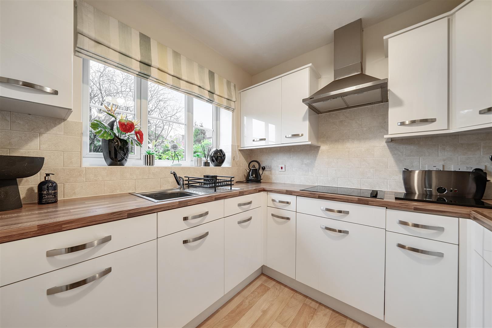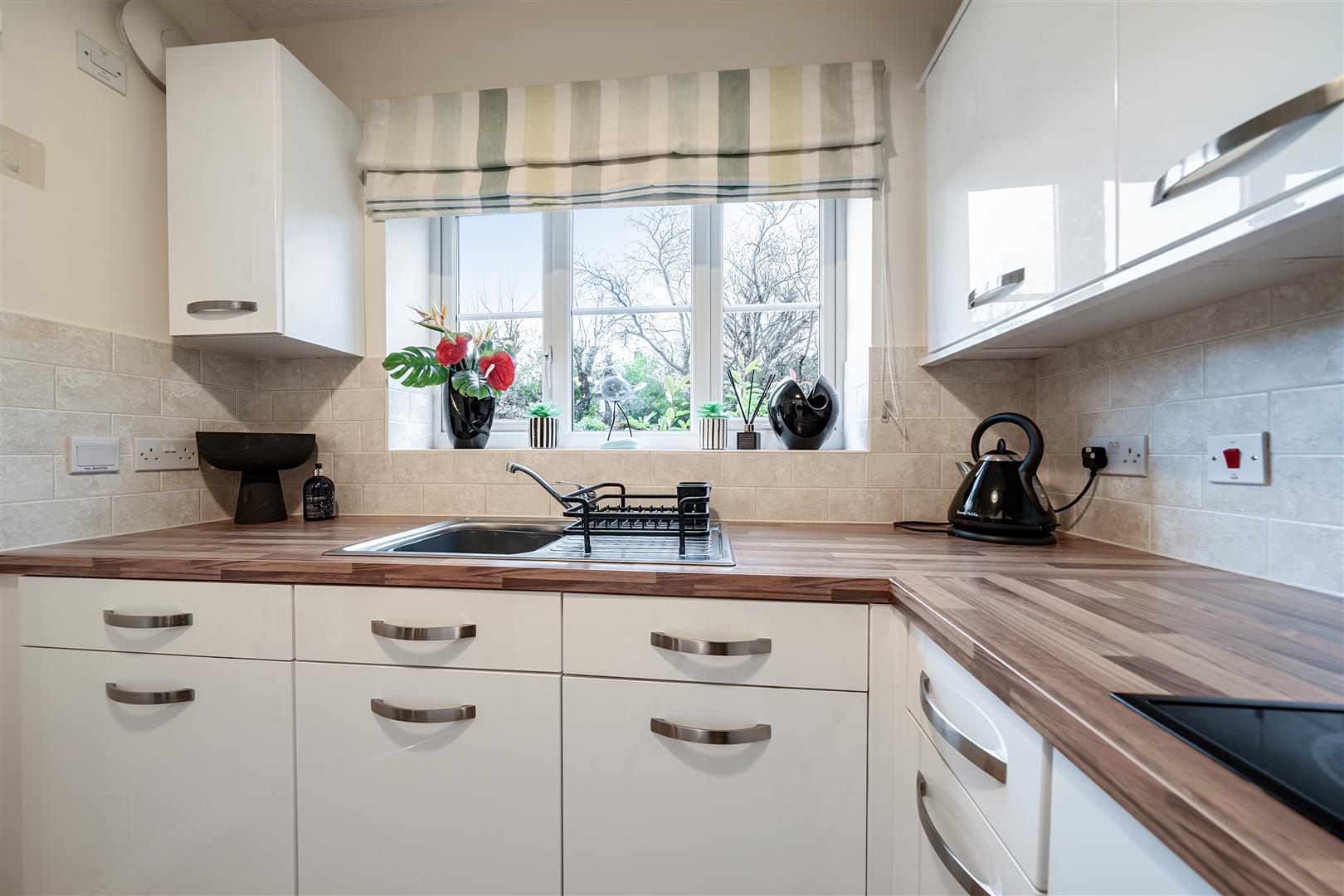 The Living Room offers ample space for living and dining room furniture and benefits from a feature electric fire with attractive surround. A French door opens to the owners private patio area with lovely views of the communal gardens and a further door leads through to the Kitchen. This room also benefits from two useful storage cupboards.