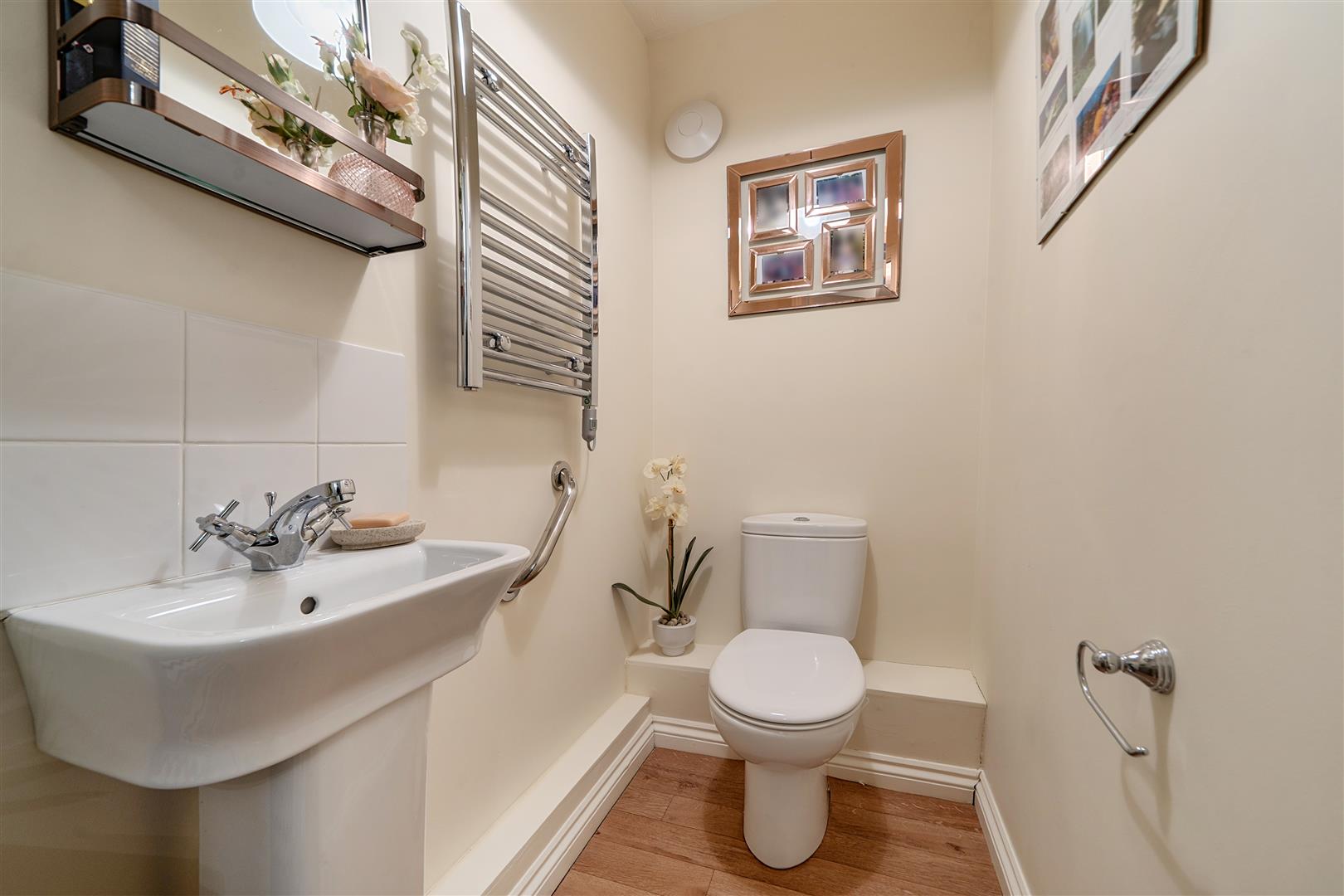 The Shower Room offers a curved shower with handrail, a WC, wash hand basin with vanity unit beneath and a heated towel rail.