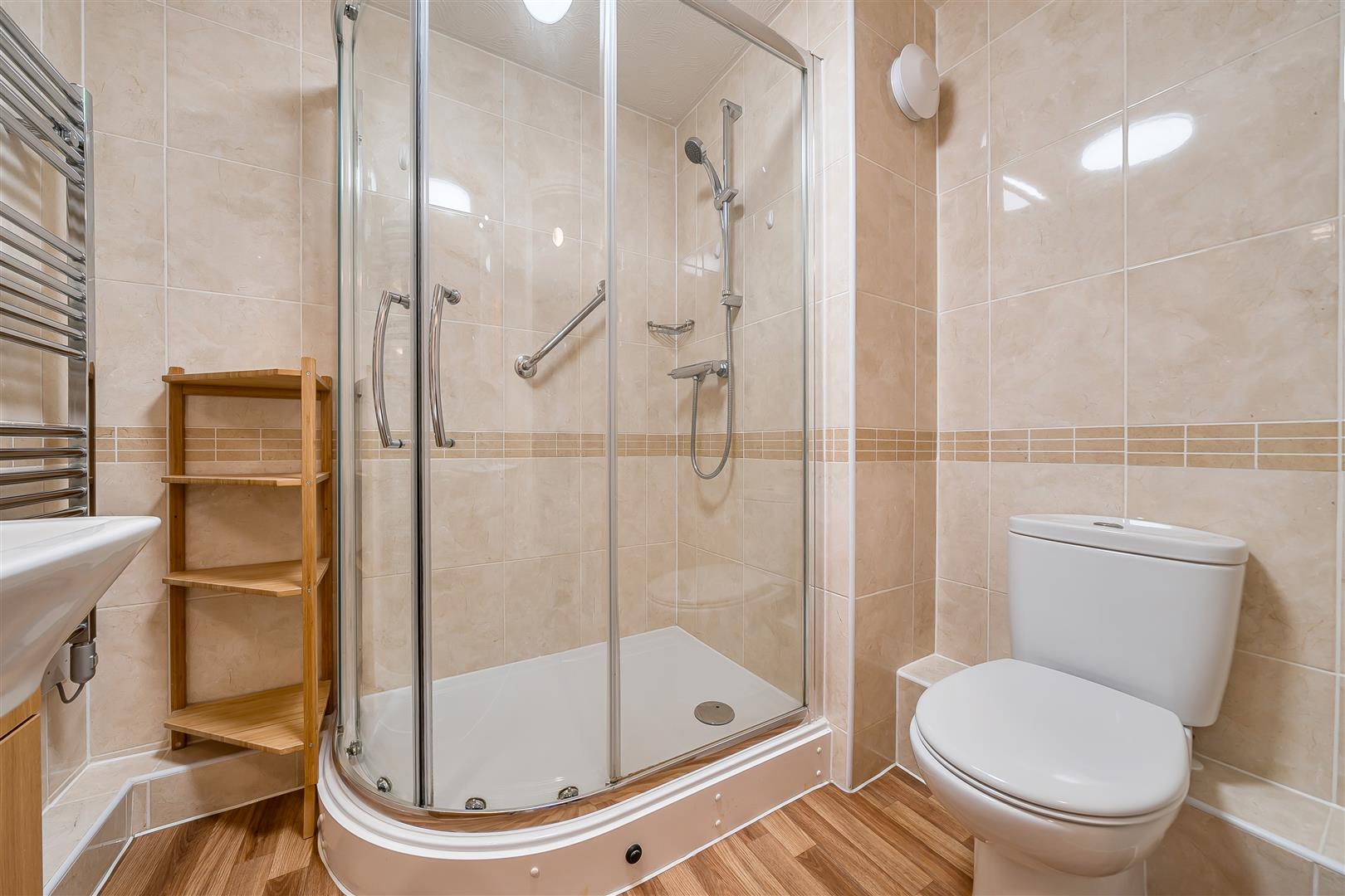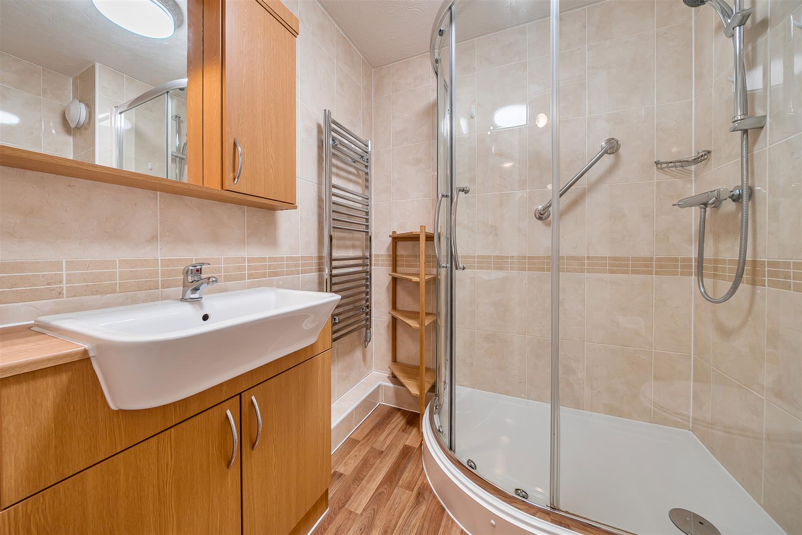 The Shower Room offers a curved shower with handrail, a WC, wash hand basin with vanity unit beneath and a heated towel rail.