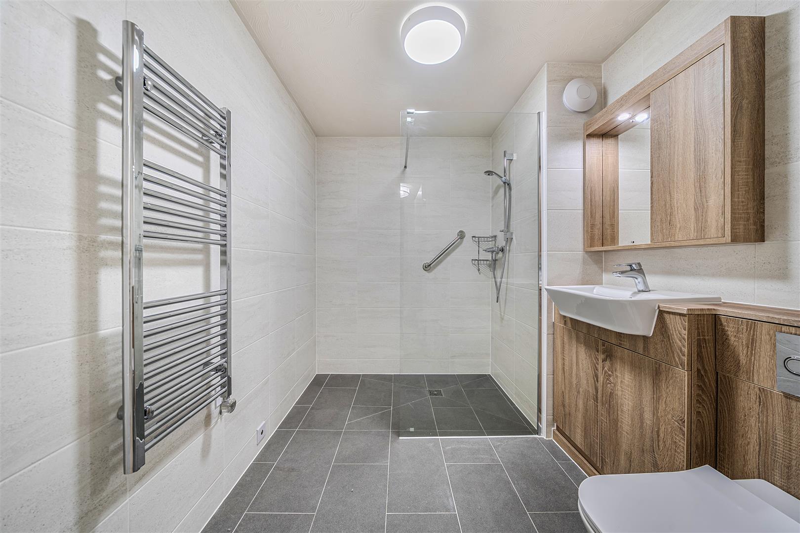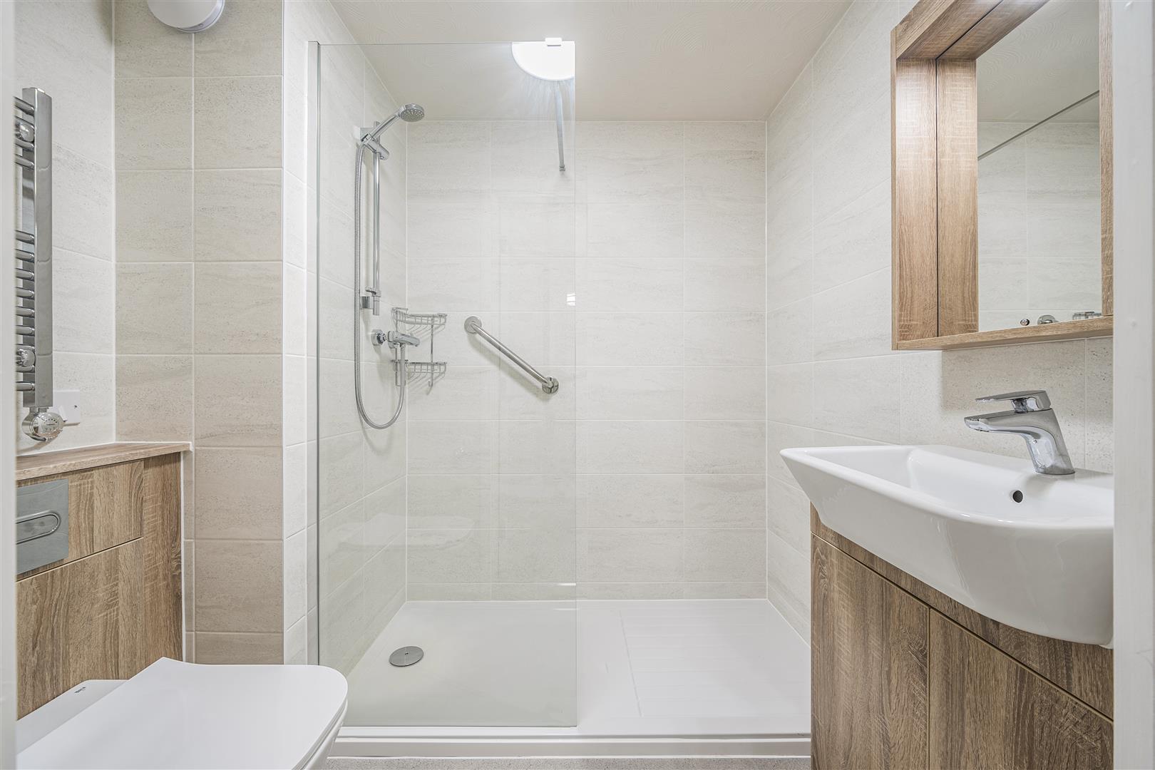 The Shower room offers a large walk-in shower with handrail, a WC, wash hand basin with vanity unit beneath and a heated towel rail.