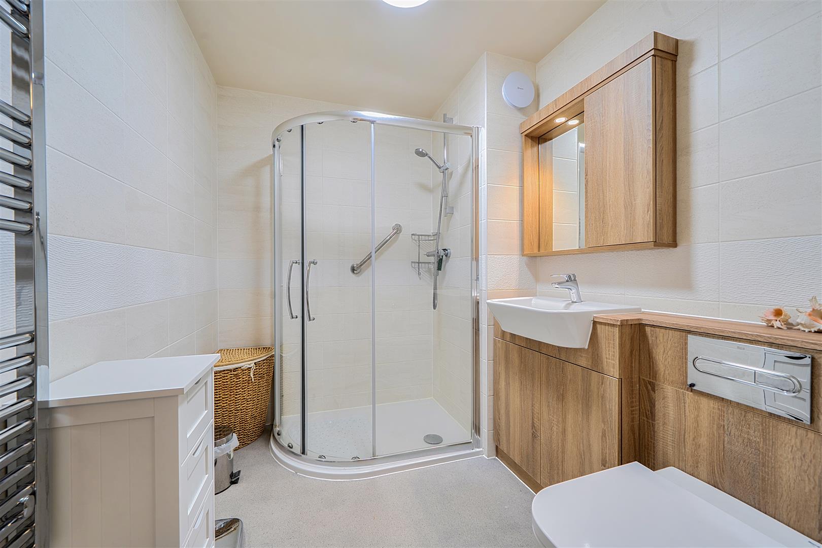 The Shower Room offers a large shower cubicle with handrail, heated towel rail, a WC and wash hand basin with vanity unit beneath.