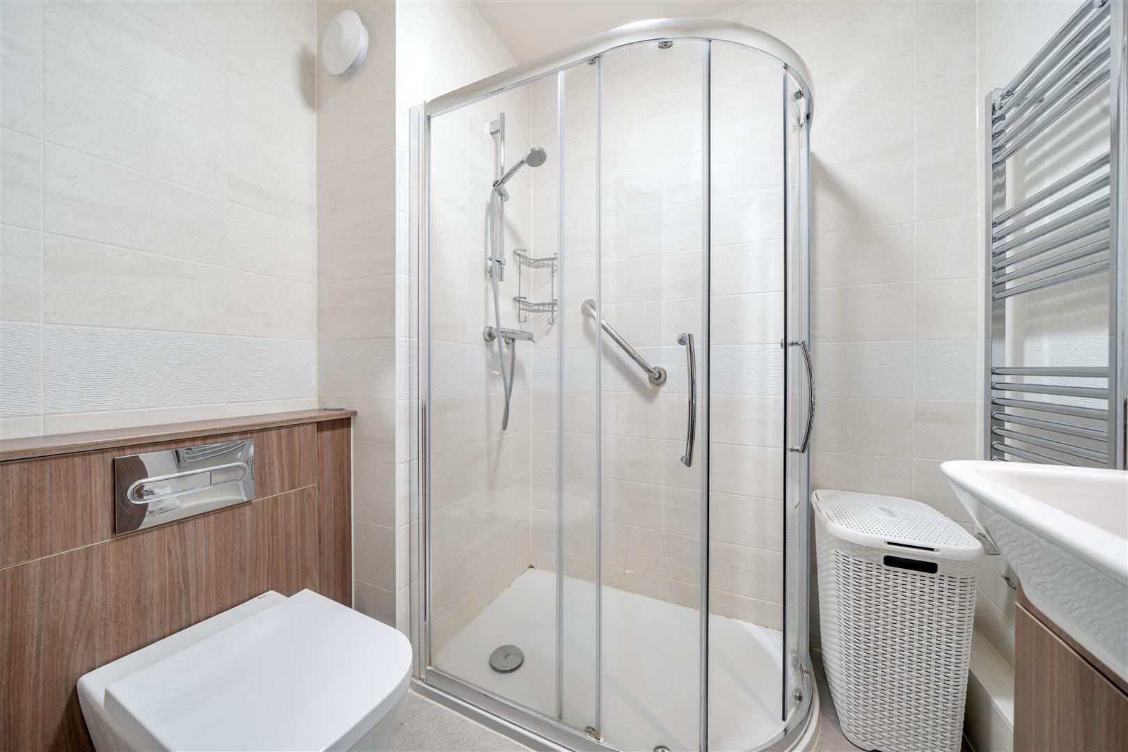 The Shower Room offers a large shower cubicle with handrail, heated towel rail, a WC and wash hand basin with vanity unit beneath.