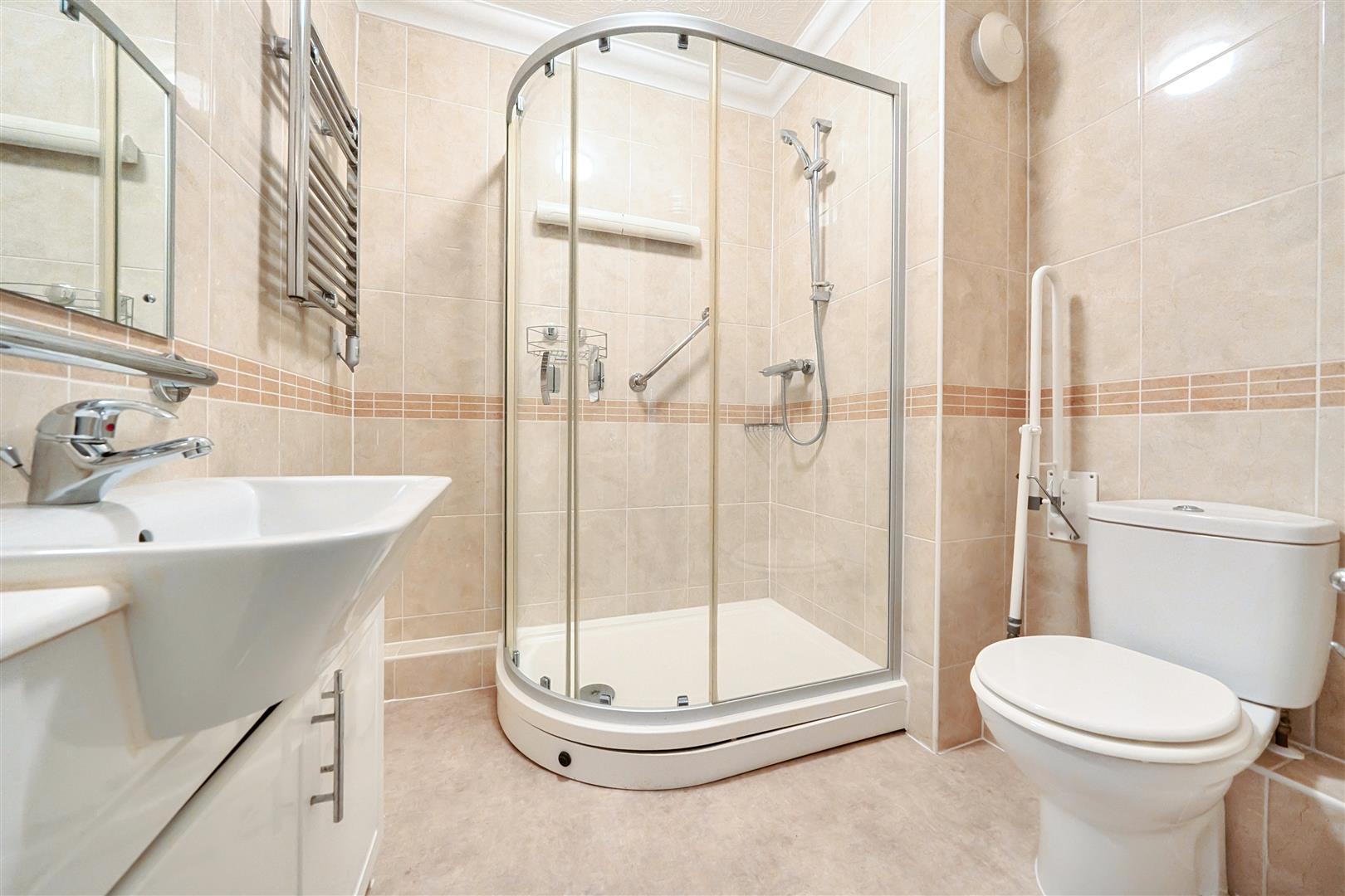The Shower Room offers a curved shower with handrail, a heated towel rail, WC and wash hand basin with vanity unit beneath.