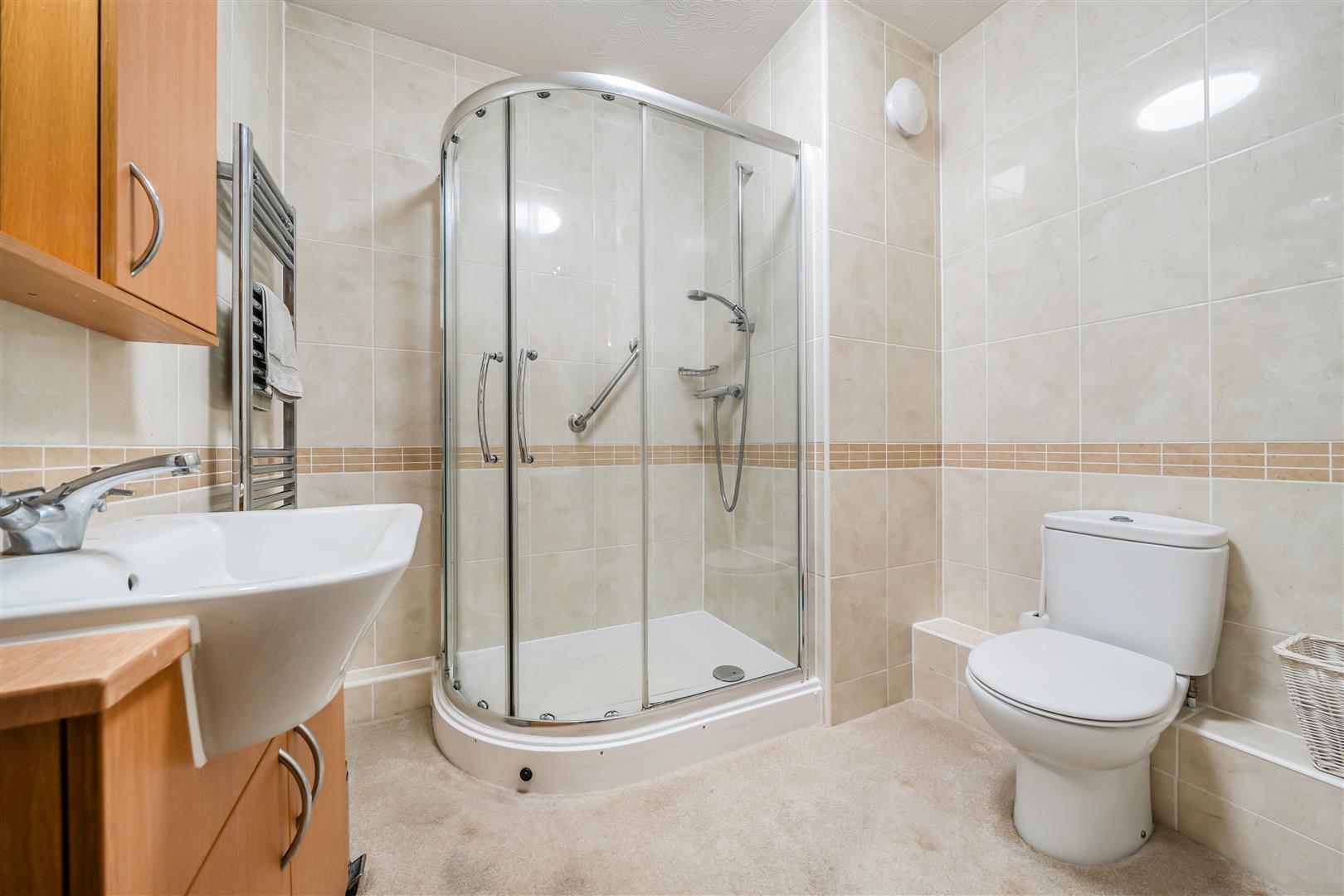 The Shower Room offers a curved shower with handrail, a WC, wash hand basin with vanity unit beneath and a heated towel rail.
