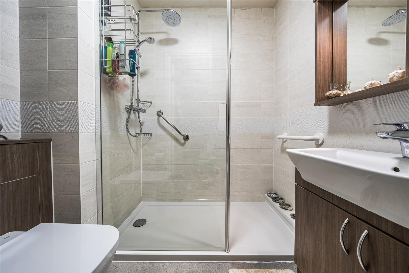 The Shower Room offers a large shower cubicle with handrail, heated towel rail, a WC and wash hand basin with vanity unit beneath.