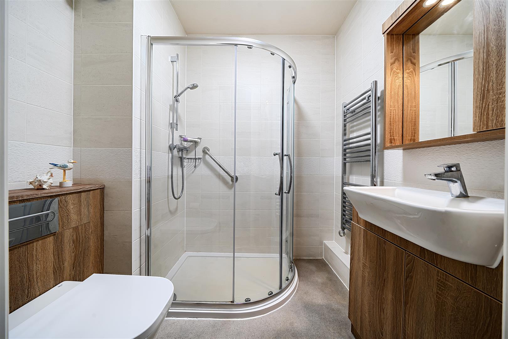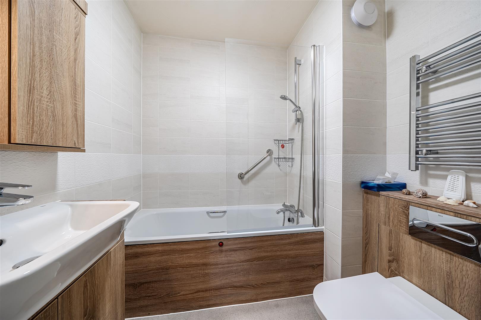 The bathroom offers a bath with overhead shower and a handrail, a WC, wash hand basin with vanity unit beneath and a heated towel rail.