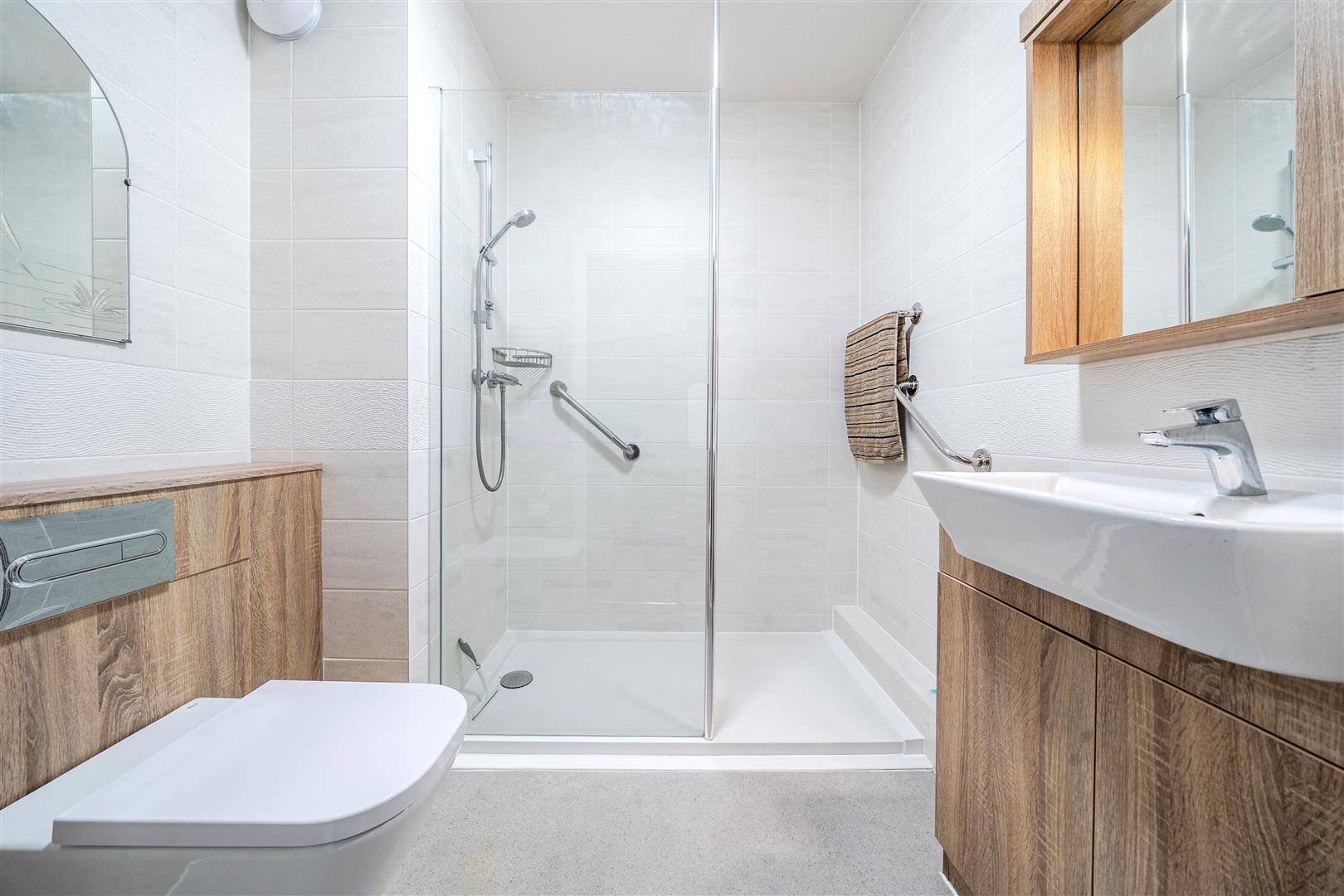 The Shower Room offers a curved shower cubicle with handrail, heated towel rail, WC and wash basin with vanity unit beneath.