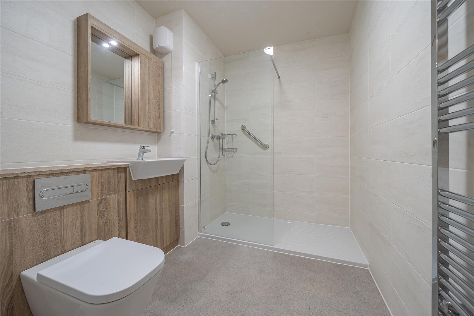 The Shower room offers a large walk-in shower with handrail, a WC and wash hand basin with vanity unit beneath.