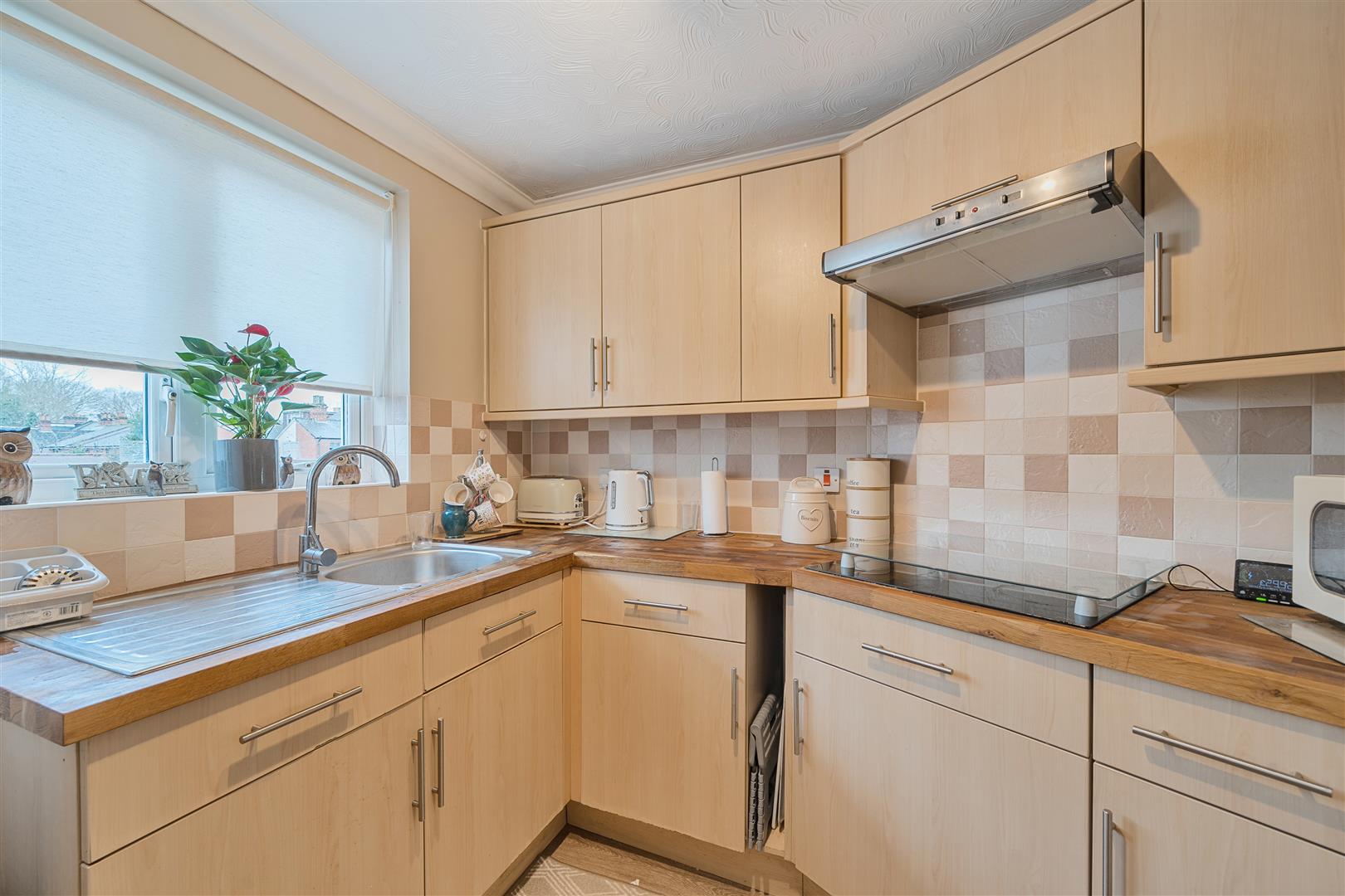 The Kitchen is accessed via the Living room and offers a range of eye and base level units with working surfaces over and tiled splashbacks. There is a built-in waist height oven, 4-ring electric hob with extractor hood over, a fridge and freezer. A window provides light and ventilation.