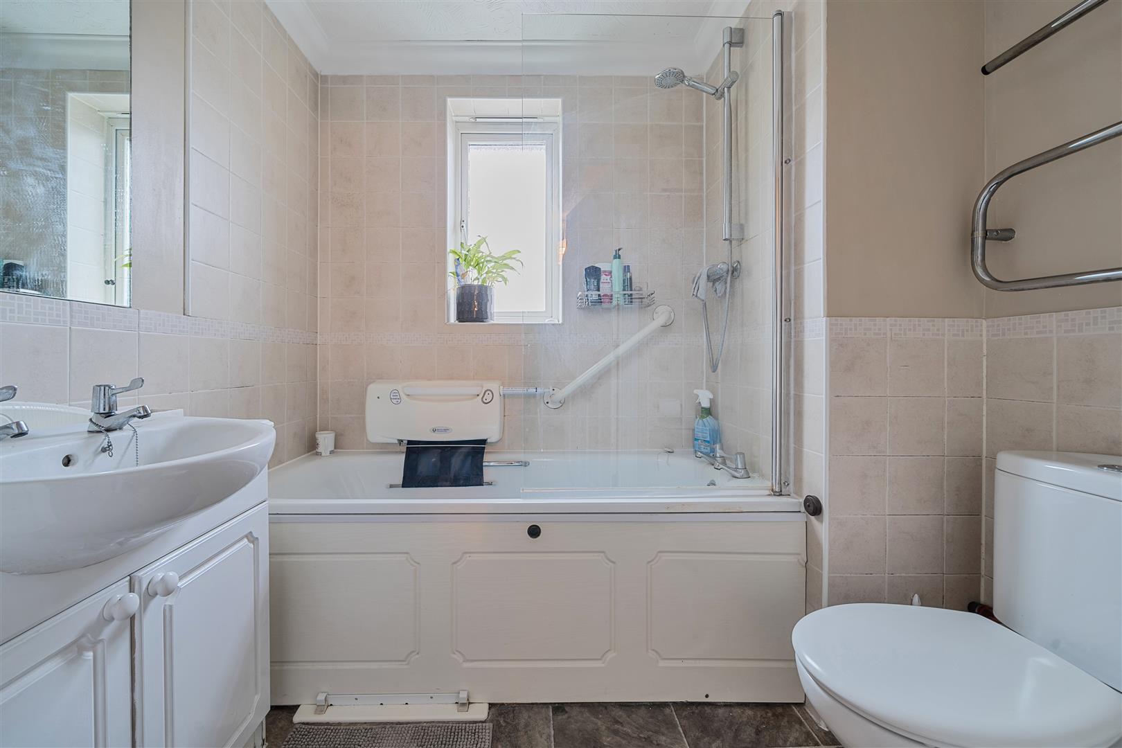 The Bathroom offers a bath tub with a overhead shower and handrail, a WC, heated towel rail and wash basin with vanity until beneath.