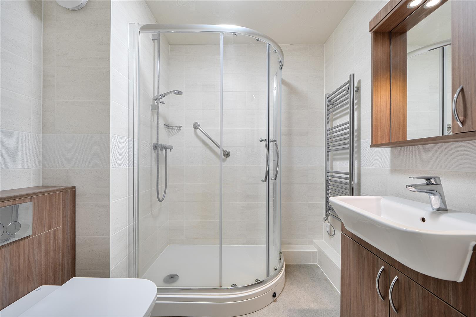 The Shower Room offers a curved shower with handrail, a WC, wash hand basin with vanity unit beneath and a heated towel rail.