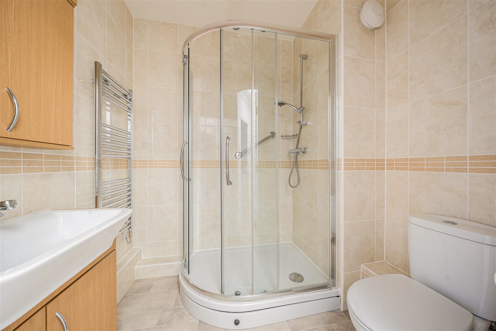 The Shower Room offers a large shower cubicle with handrail, heated towel rail, a WC and wash hand basin with vanity unit beneath.
