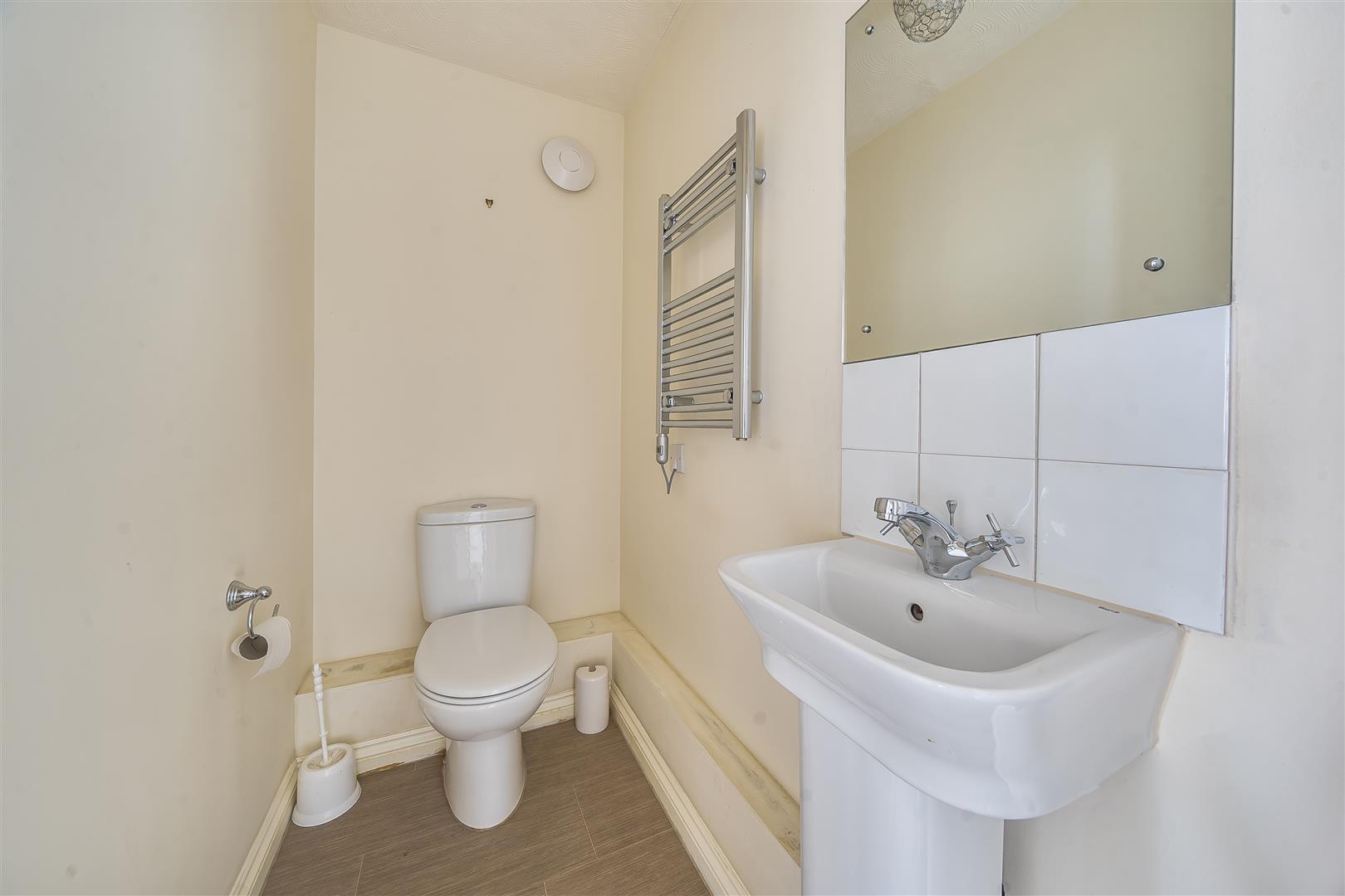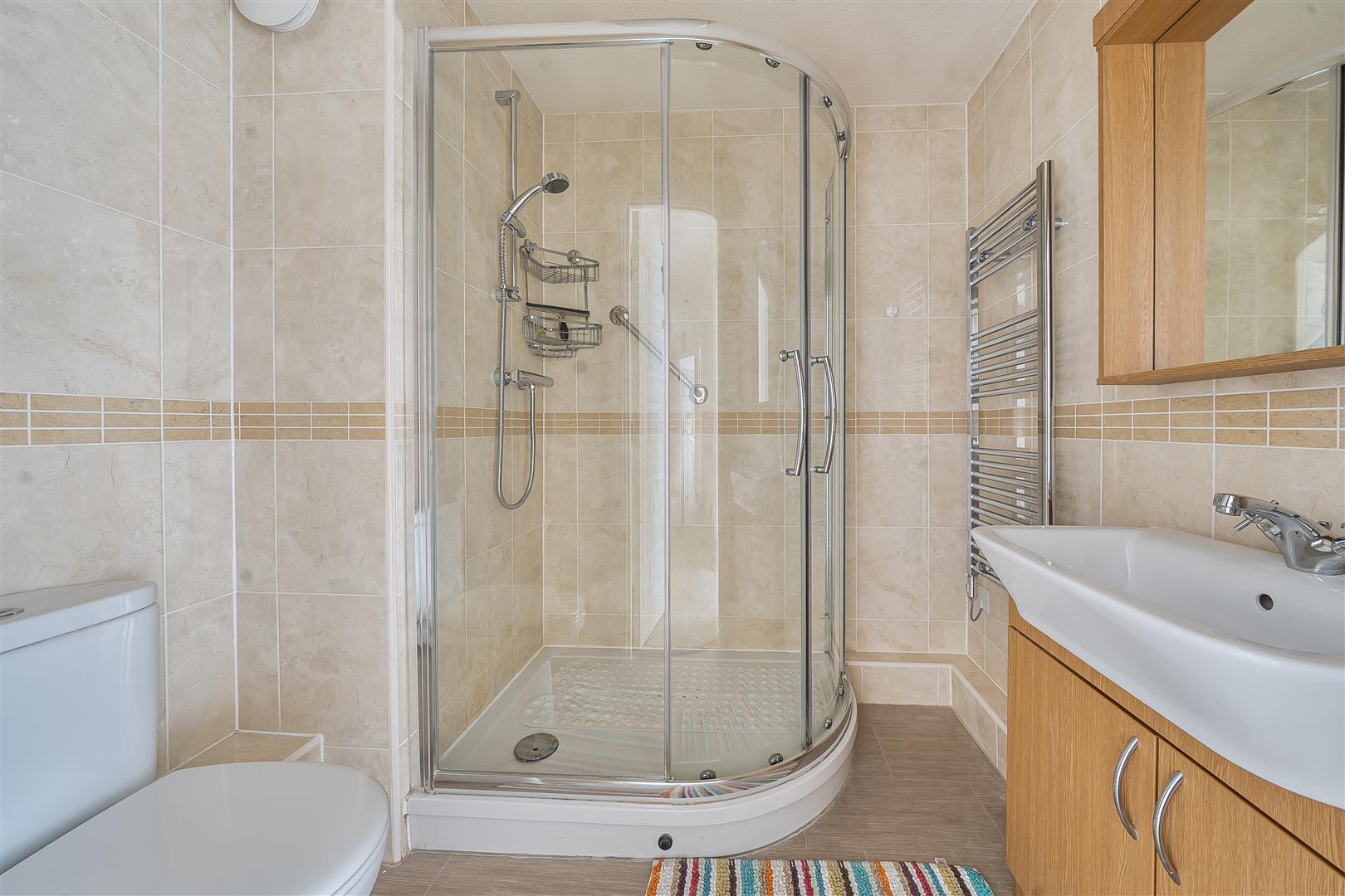The Shower room offers a curved shower with handrail, a WC, wash hand basin with vanity unit beneath and a heated towel rail.