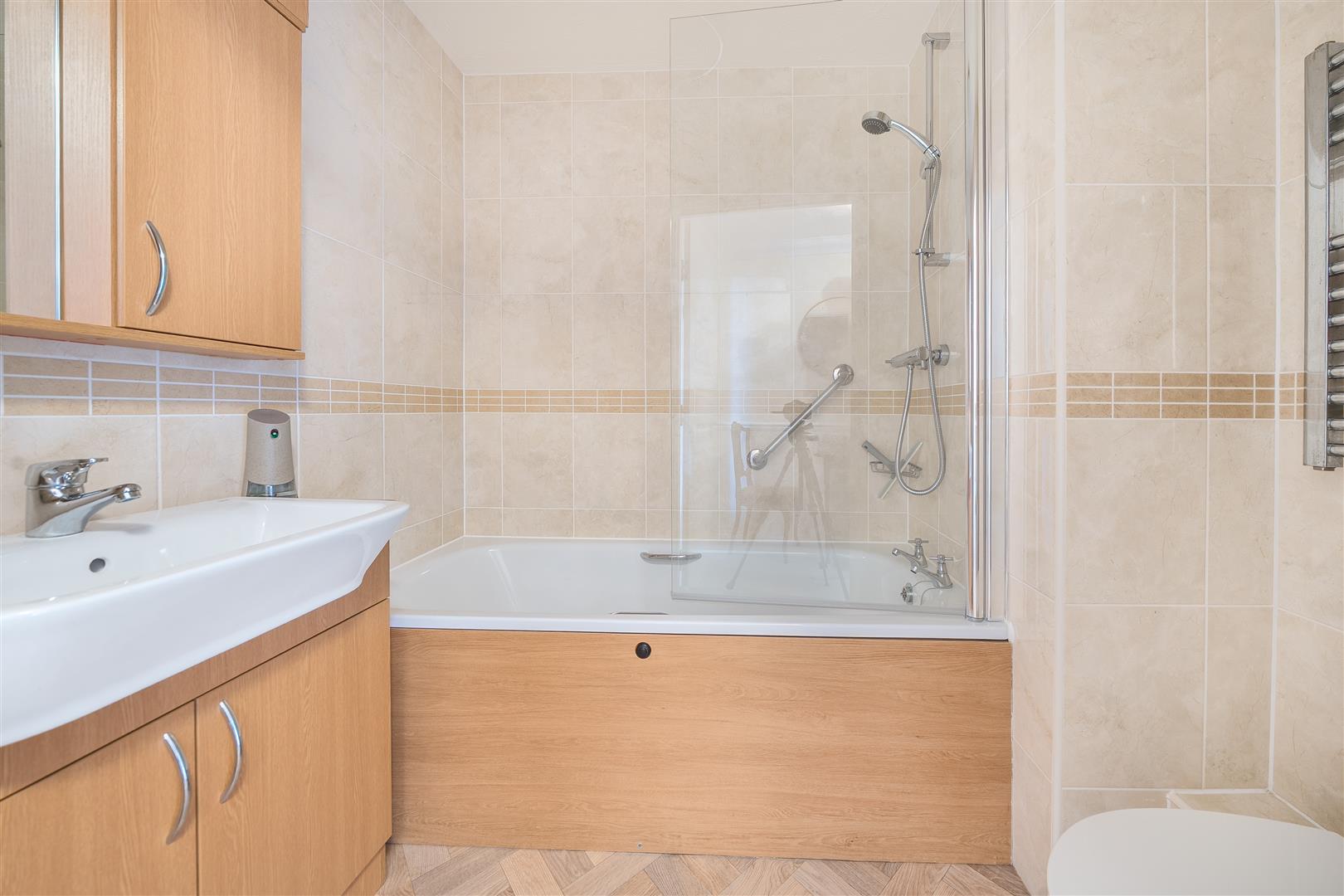 The Bathroom offers a bath tub with overhead shower and handrail, a WC, wash hand basin with vanity unit beneath and a heated towel rail.
