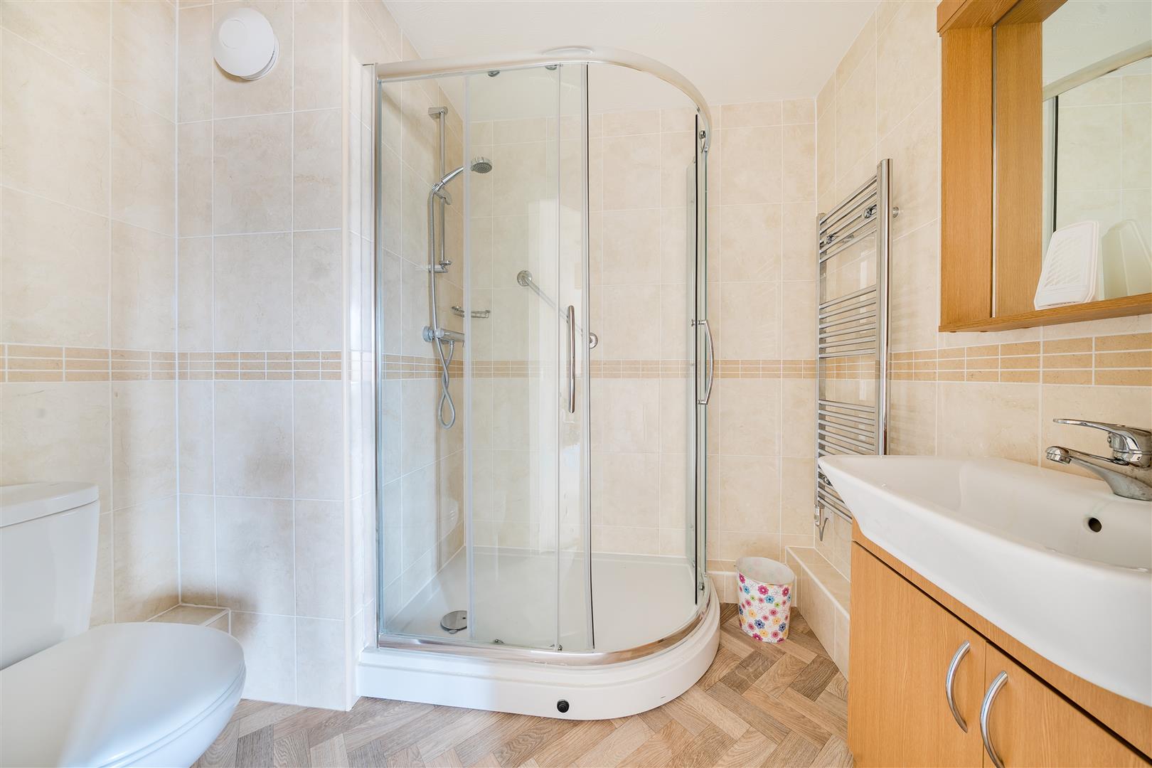 Bedroom one is a generous double room with a built in mirrored wardrobe plus an additional fitted wardrobe. An ensuite offers a curved shower, a WC, heated towel rail, wash hand basin with vanity unit beneath and cabinet above.