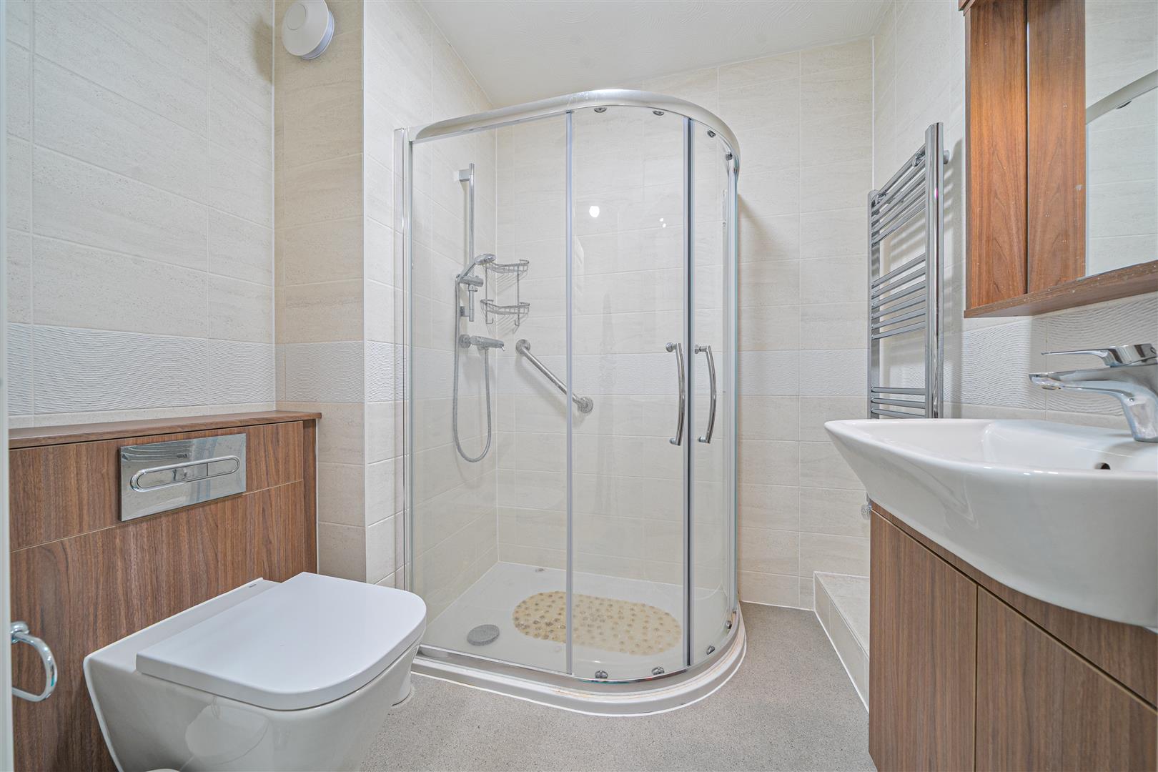 The Shower Room offers a large curved shower with handrail, a heated towel rail, WC and wash hand basin with vanity unit beneath.